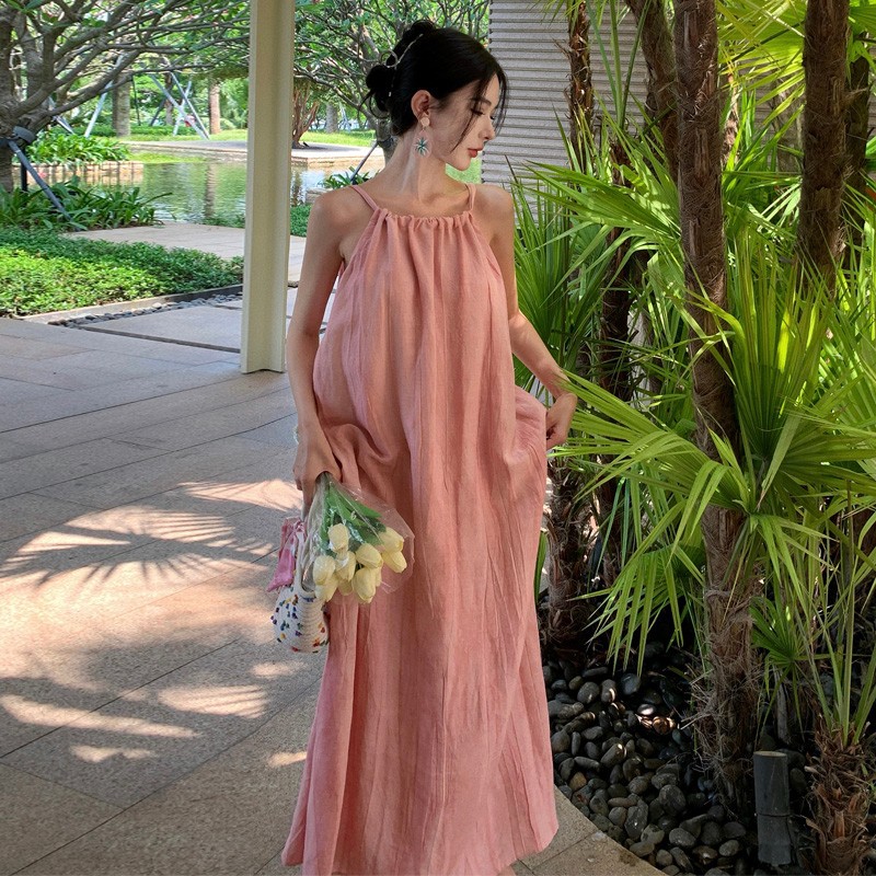 海边度假粉色无袖吊带连衣裙宽松慵懒风夏季新款甜辣裙子女