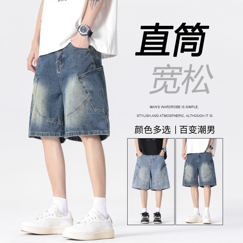 牛仔短裤男士潮流美式复古工装休闲五分裤子夏季薄款宽松直筒中裤