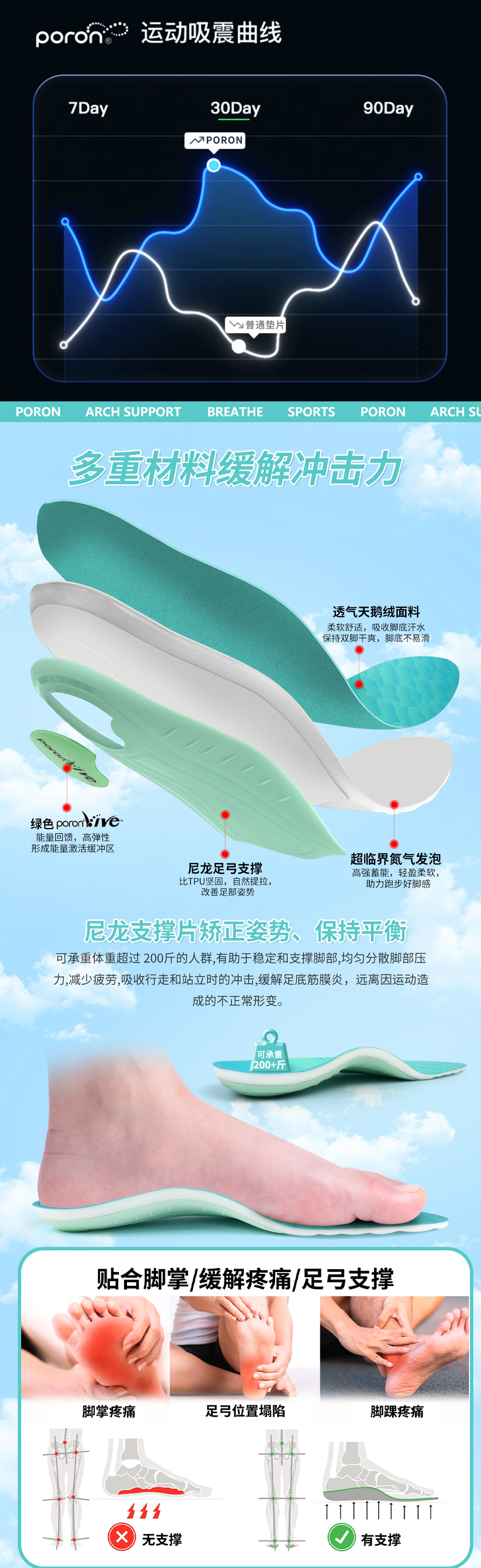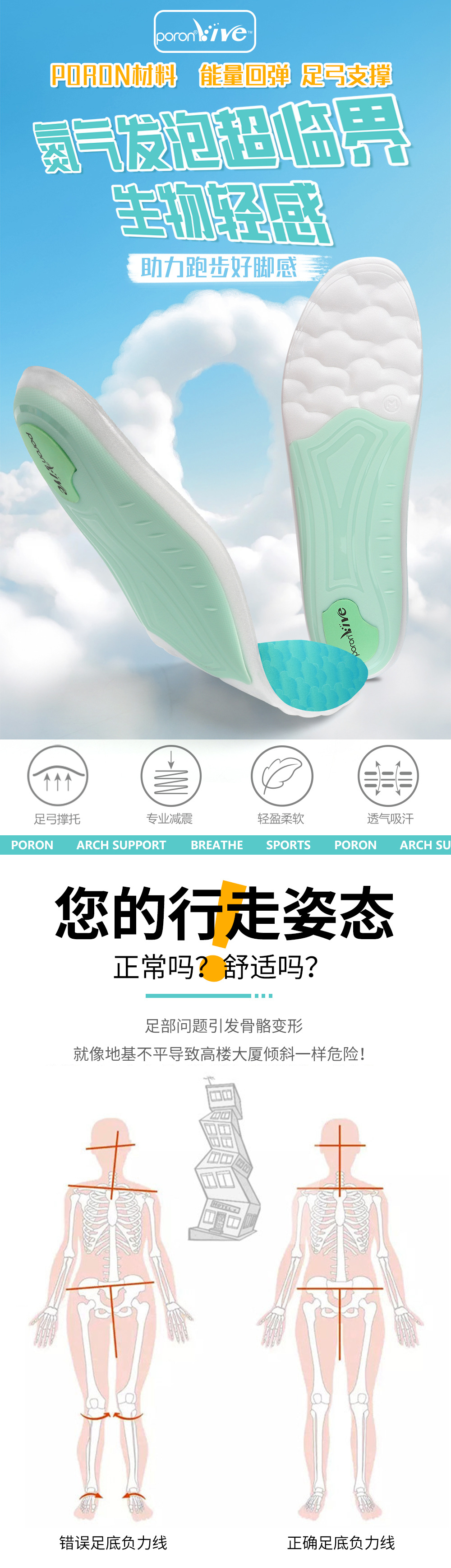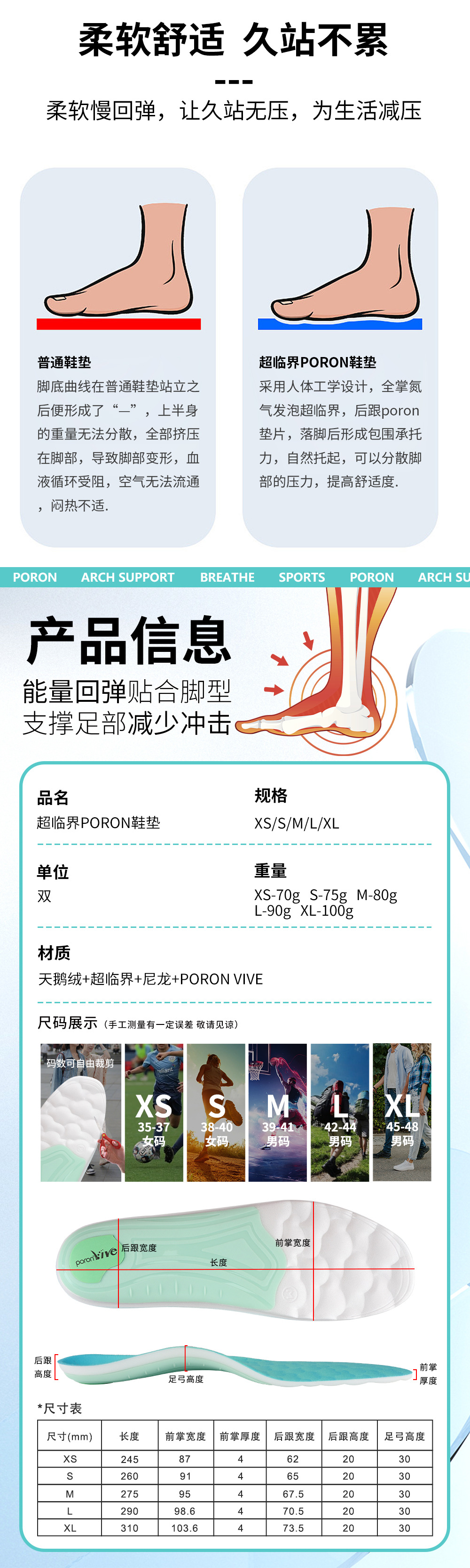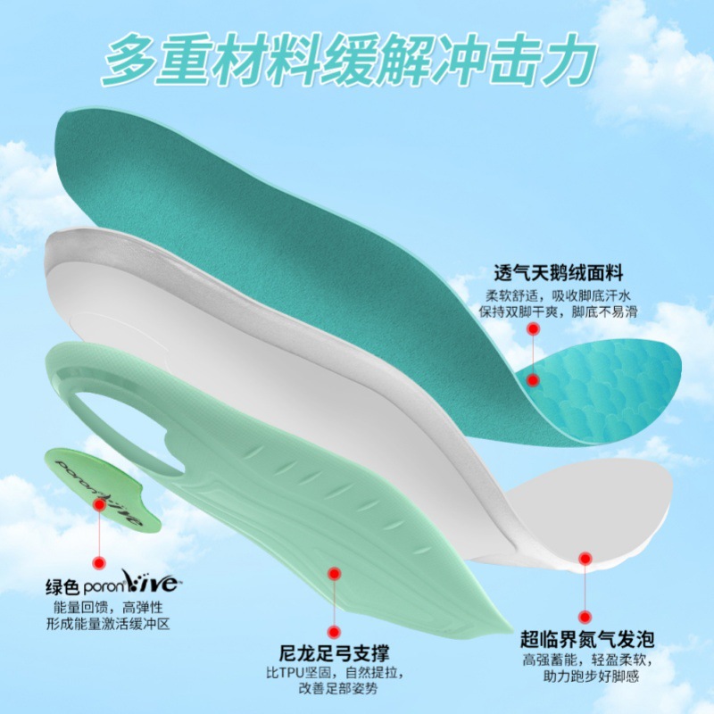 软底缓压透气超临界poron轻便舒适足弓支撑鞋垫男士女士矫正鞋垫