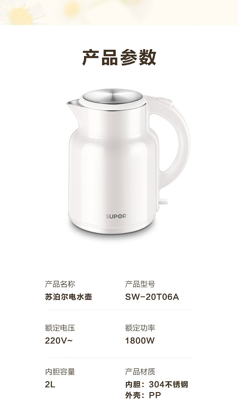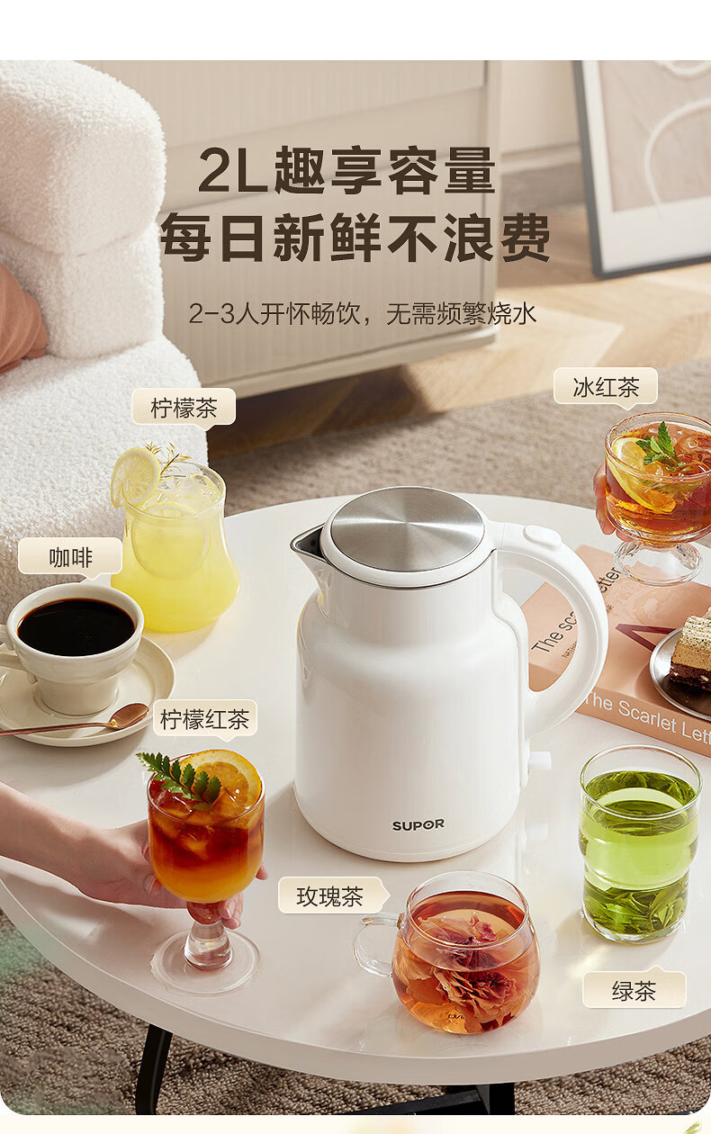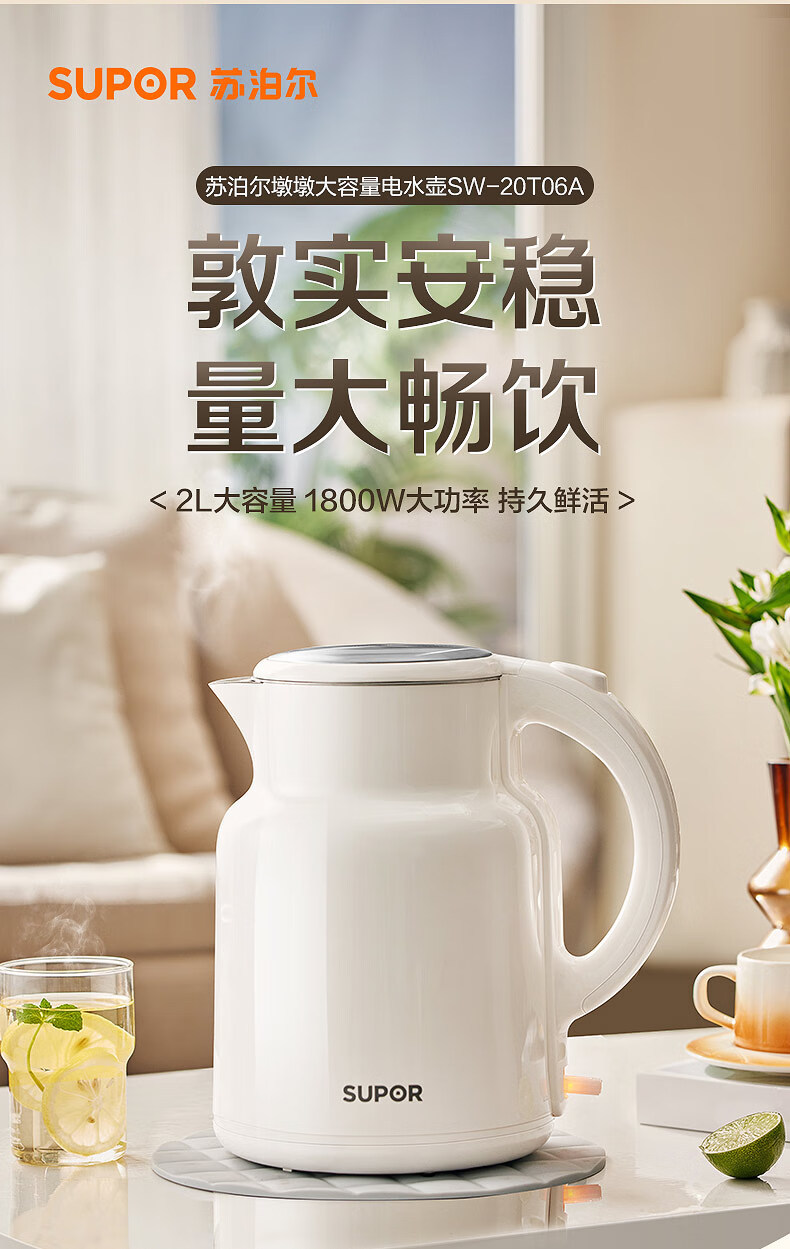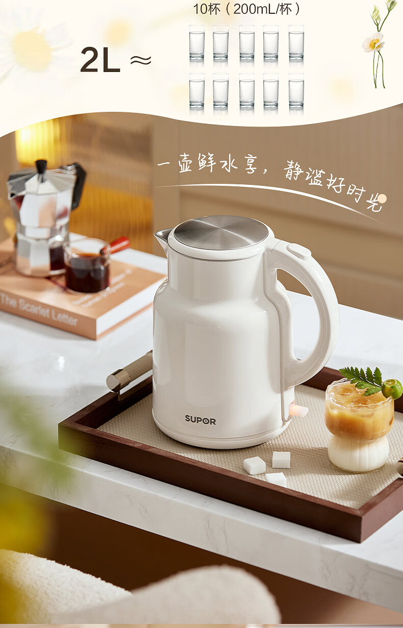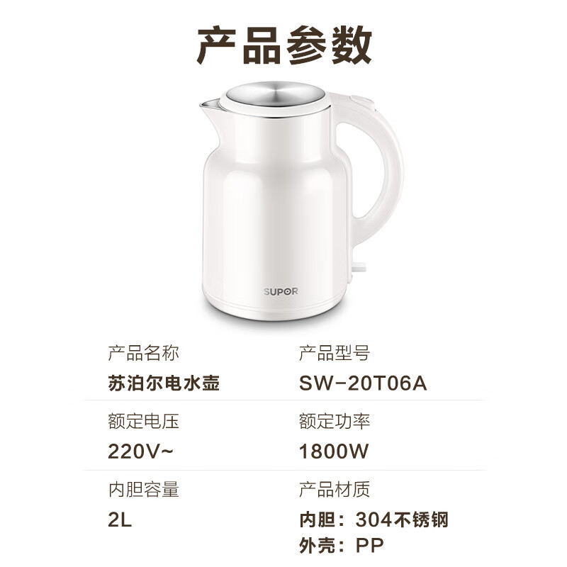 苏泊尔电水壶热水壶2L全钢无缝双层防烫电热水壶烧水壶SW-20T06A