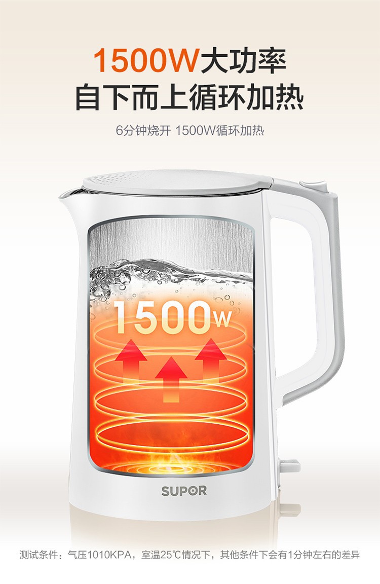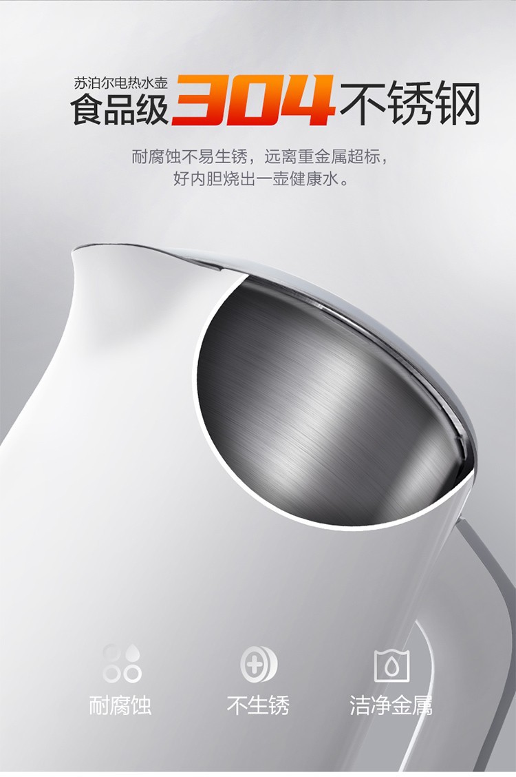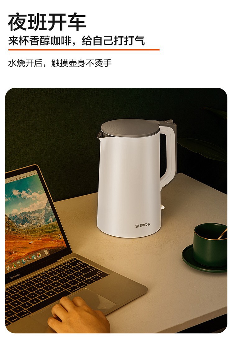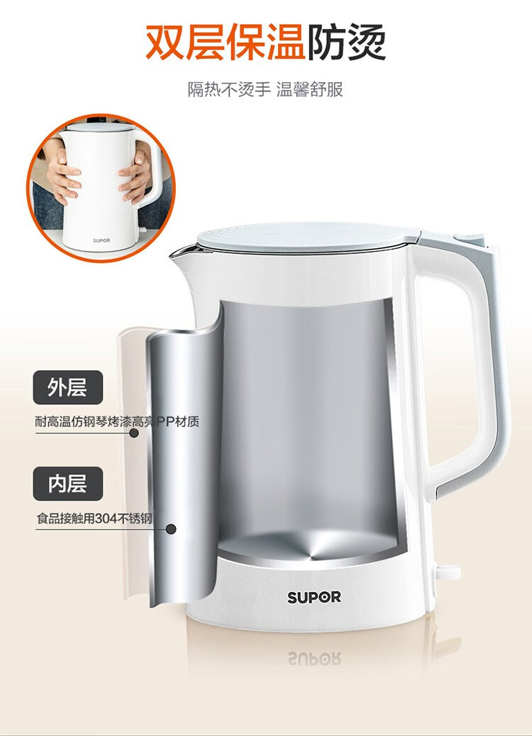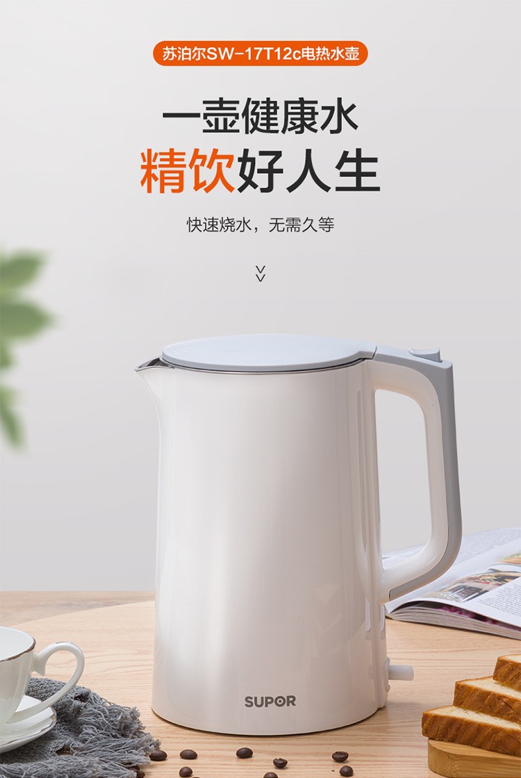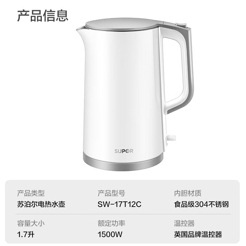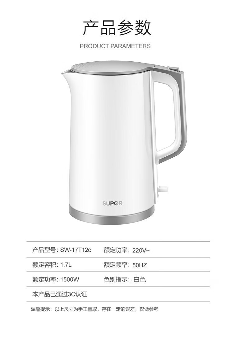 苏泊尔电热水壶1.7L双层防烫304不锈钢开水壶SW-17T12D/SW-17T12C