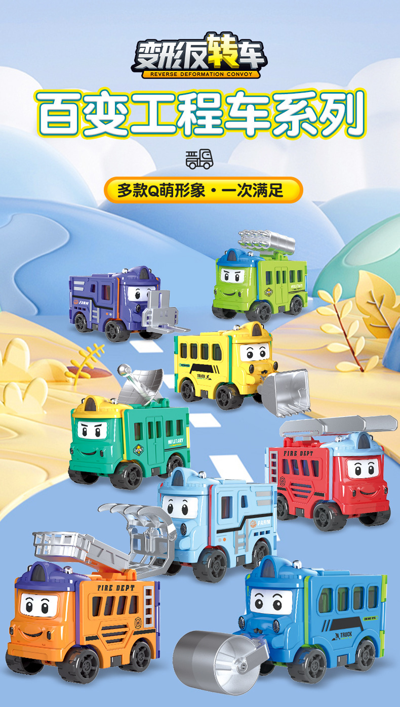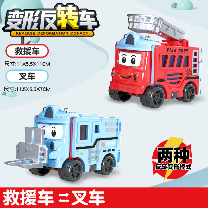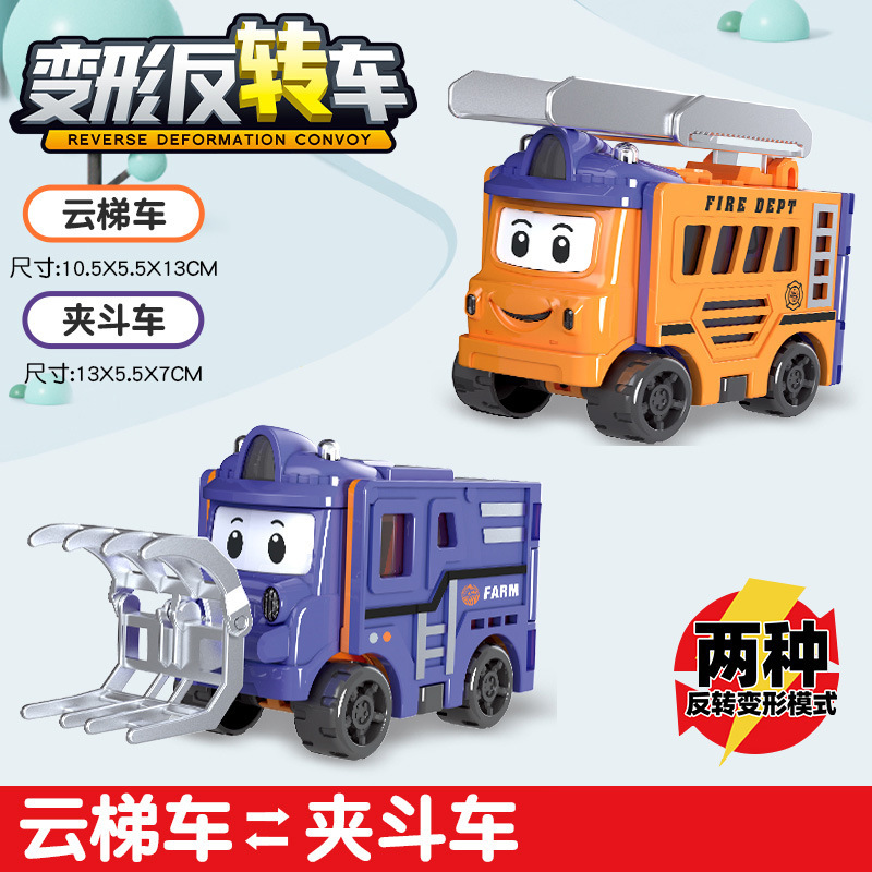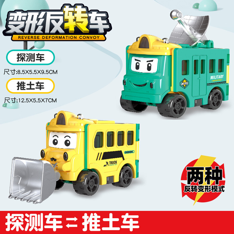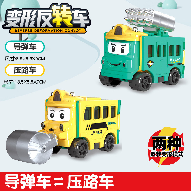 跨境儿童百变变形反转车校巴玩具惯性双面翻翻车卡通男孩汽车套装