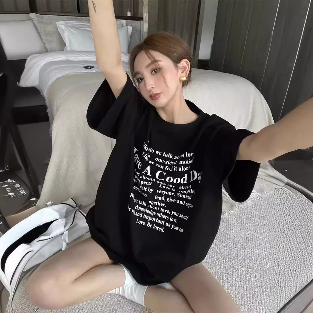 中长款字母印花圆领短袖T恤女夏季宽松慵懒美式辣妹黑色休闲上衣