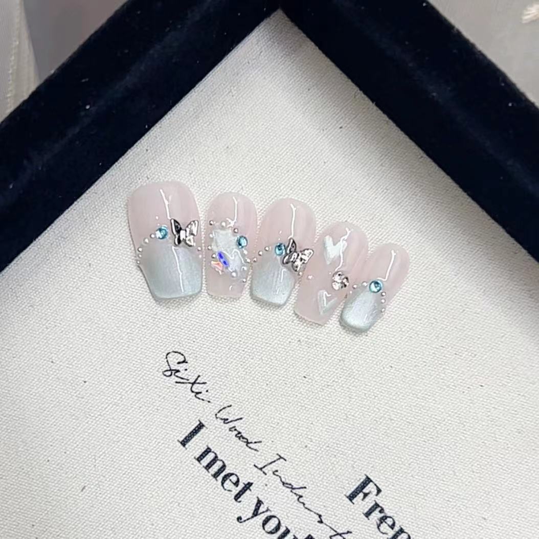 纯手工光疗穿戴甲薄荷爱心猫眼批发成品重复使用美甲贴片可拆卸