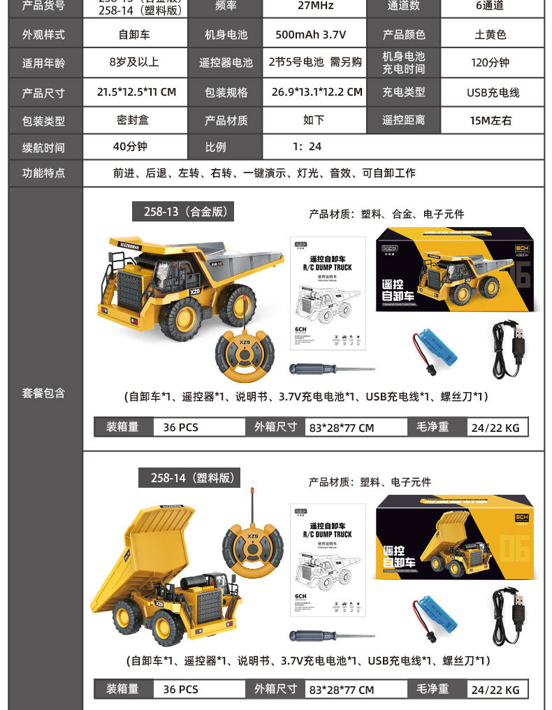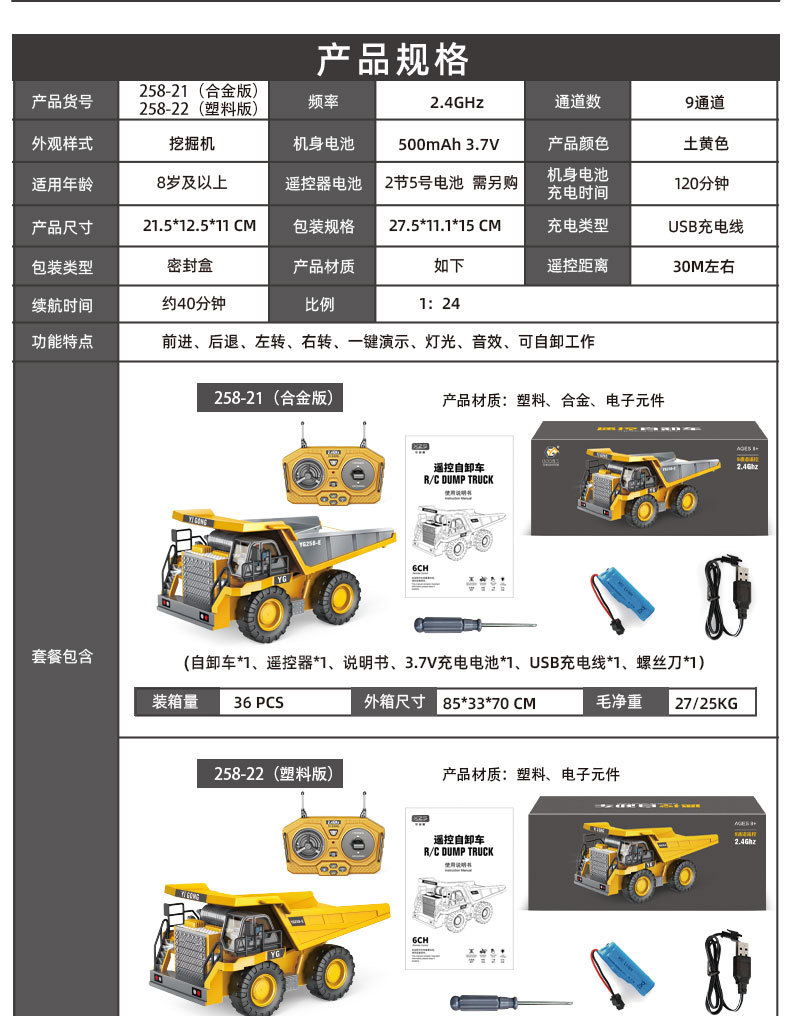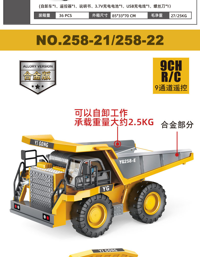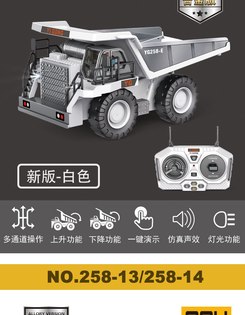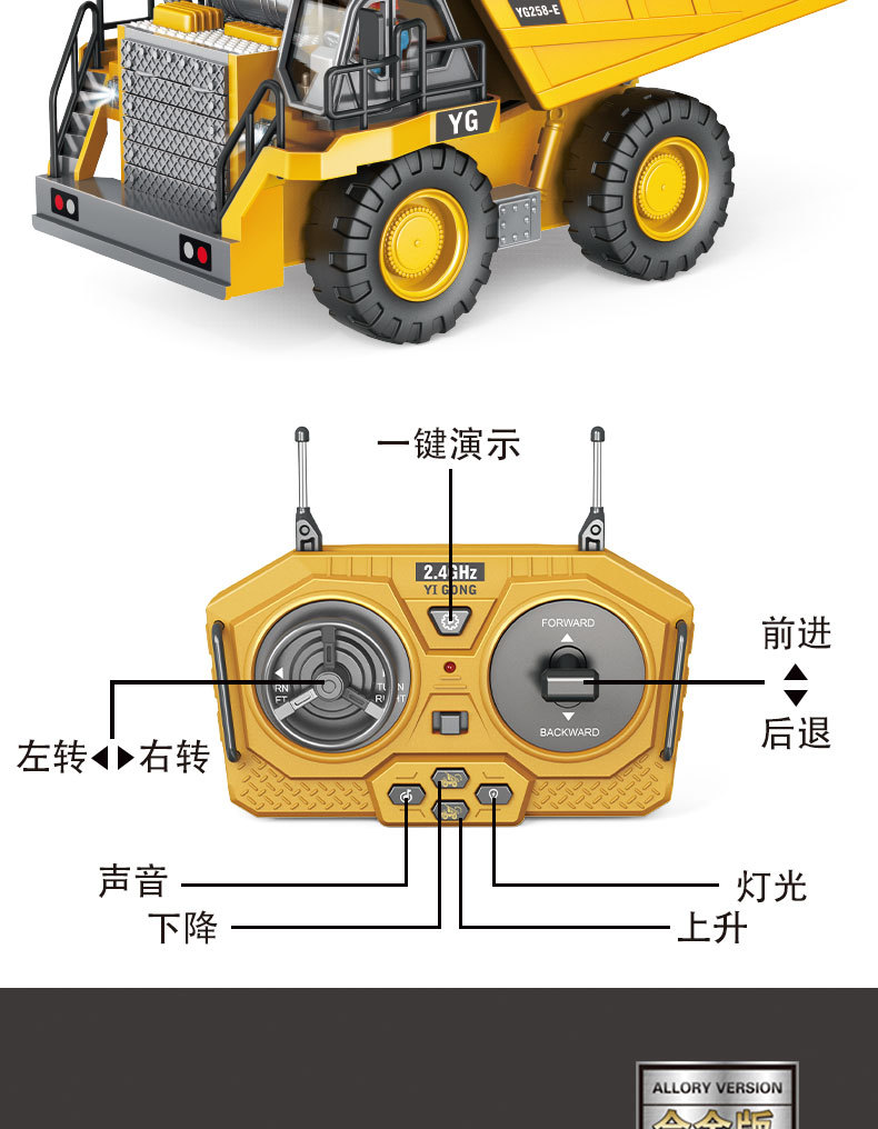 跨境1:24合金工程车遥控自卸车翻斗车仿真挖掘模型男孩儿童玩具