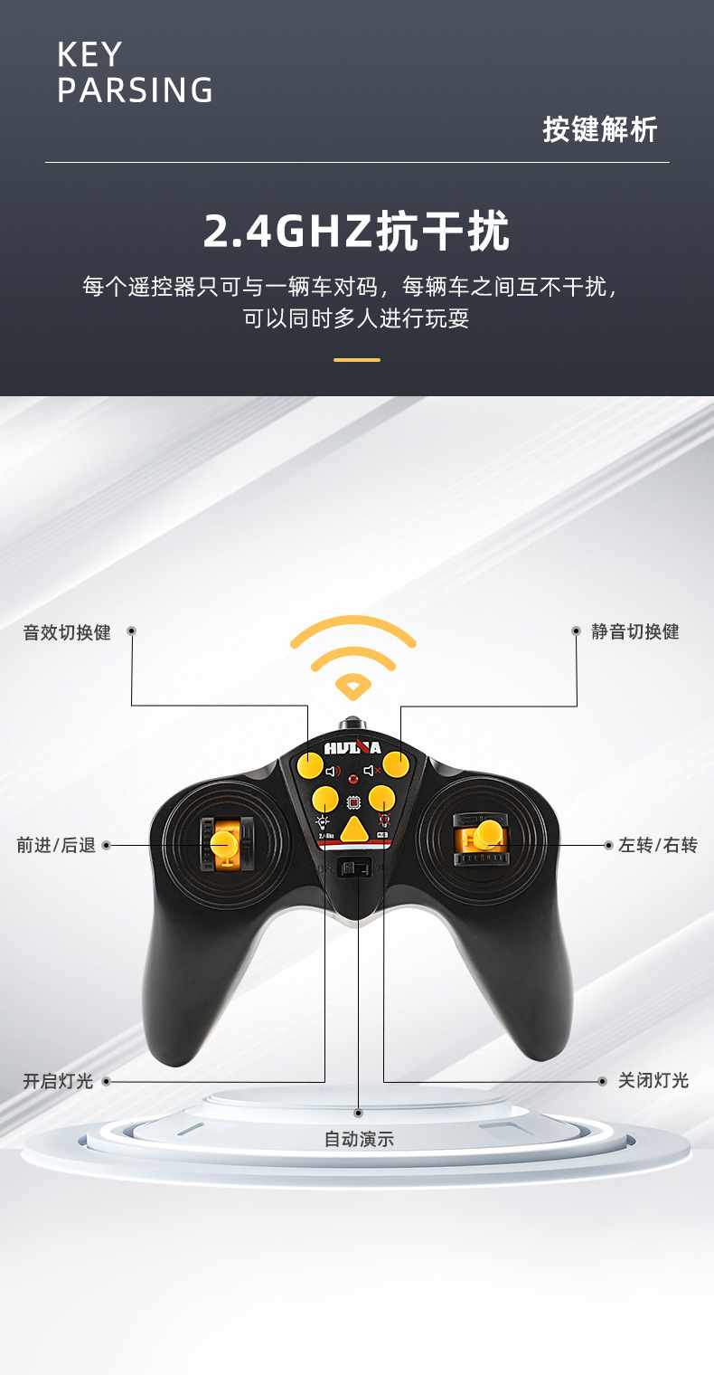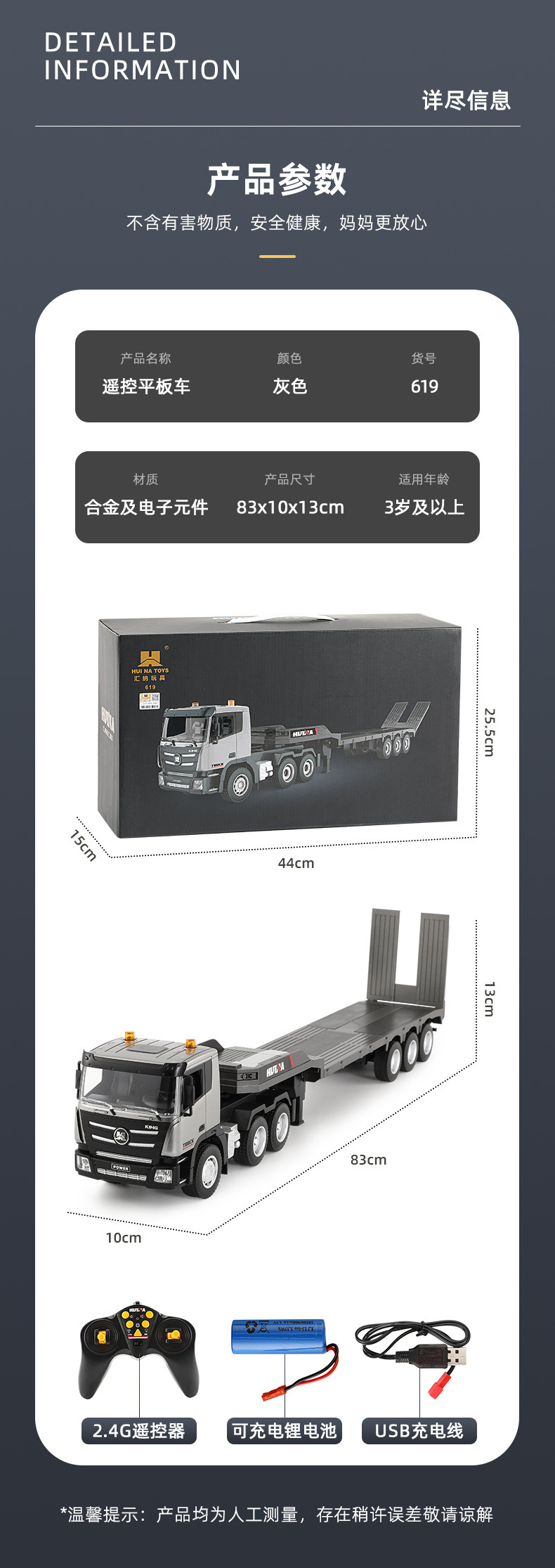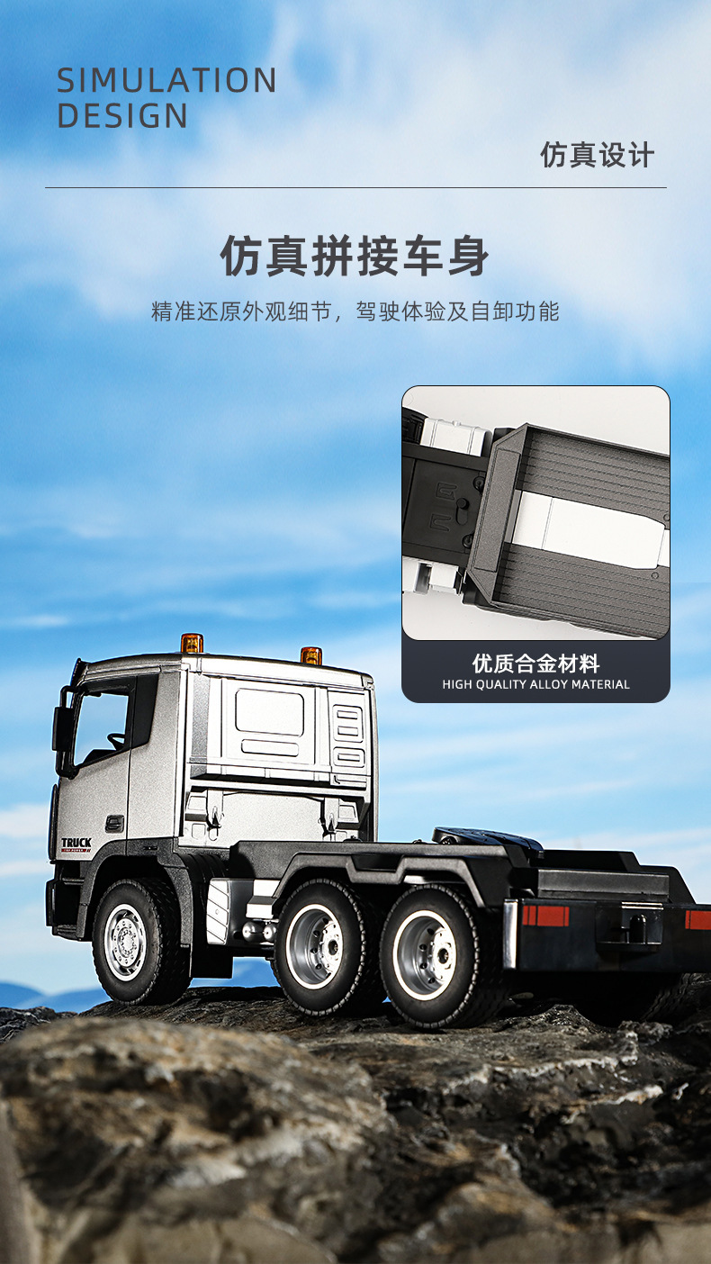 汇纳合金9通遥控半挂平板工程车仿真灯光音效1:24运输挖掘机玩具