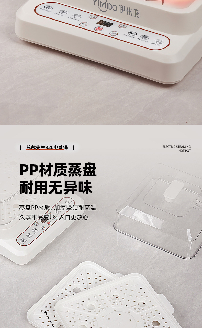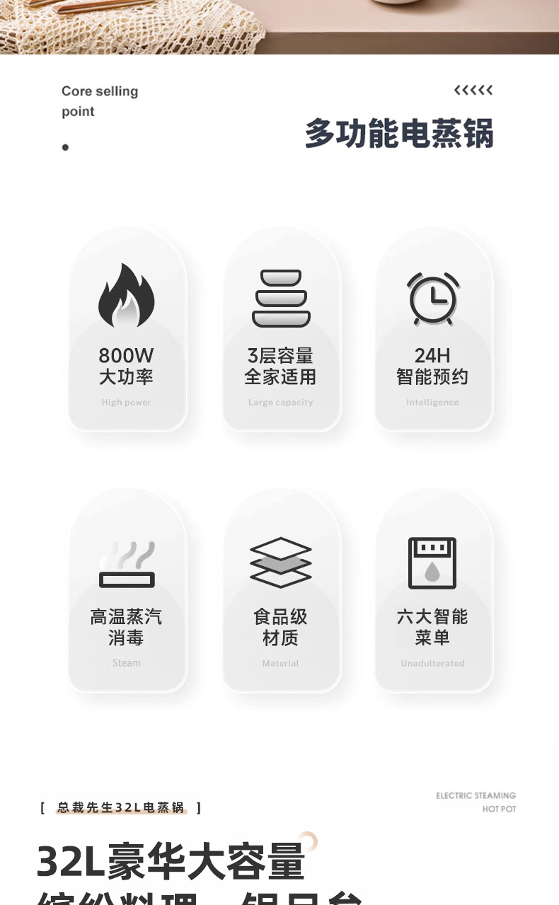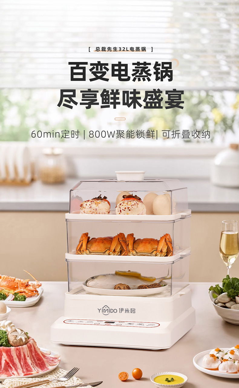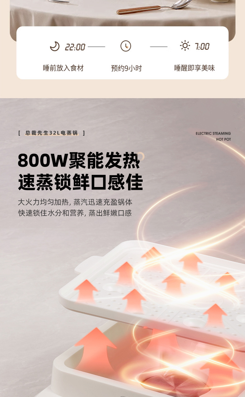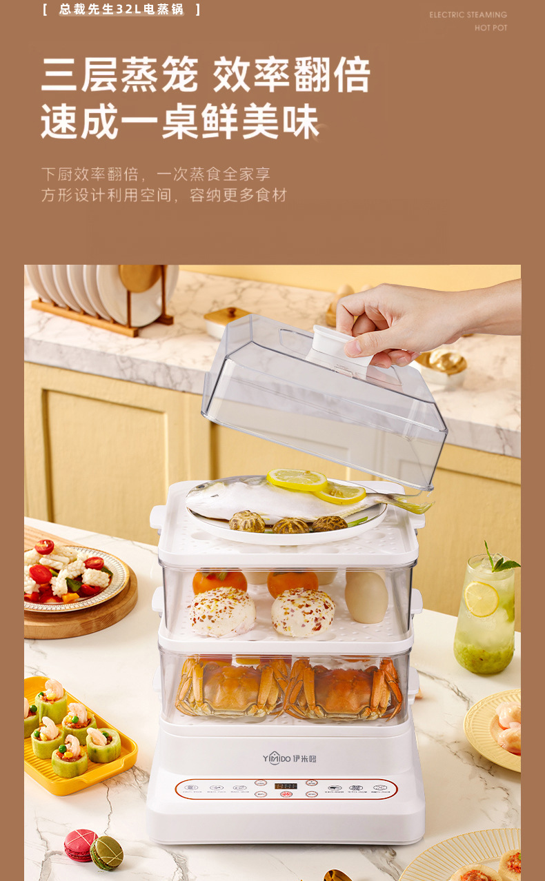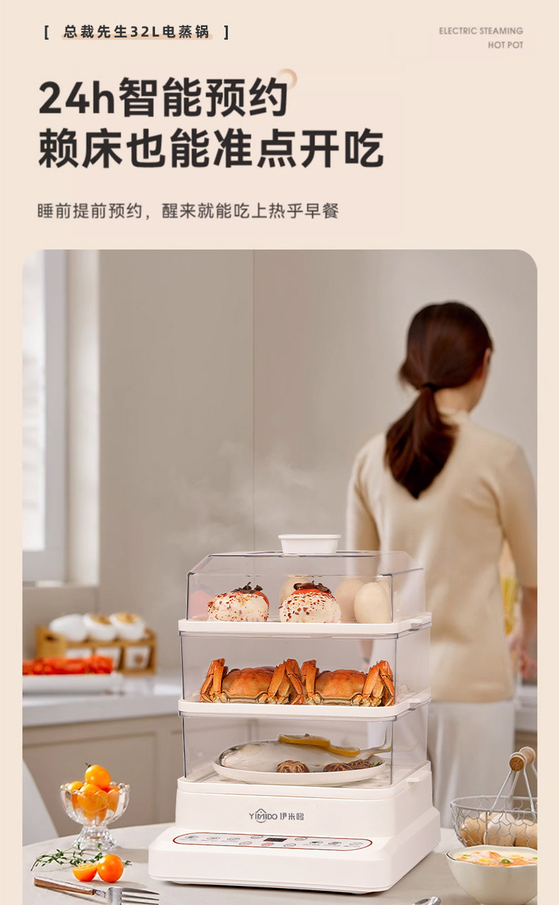 电蒸锅家用32升PC款三层电蒸笼大容量智能预约早餐机蒸煮
