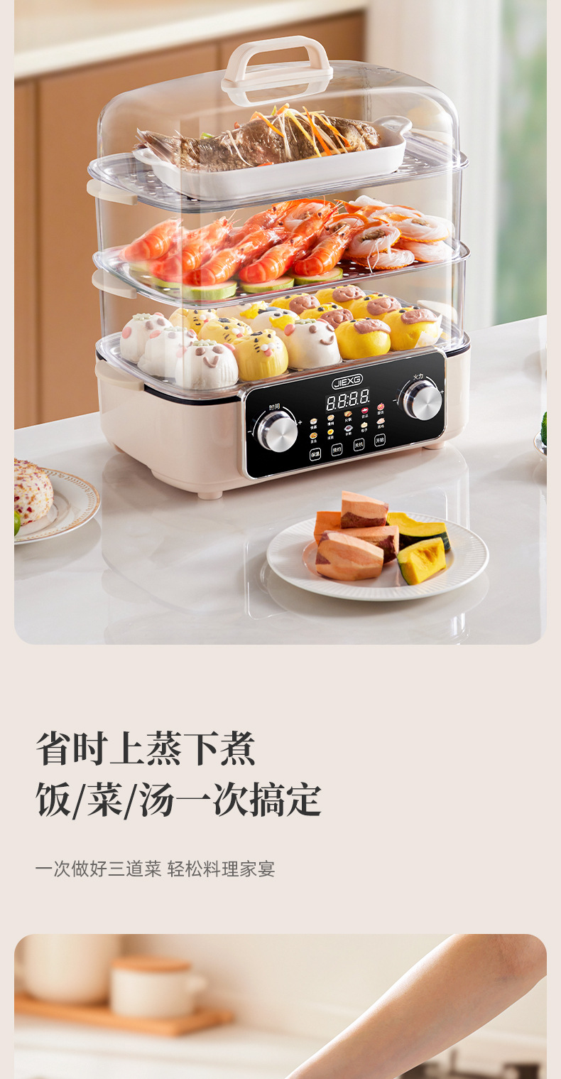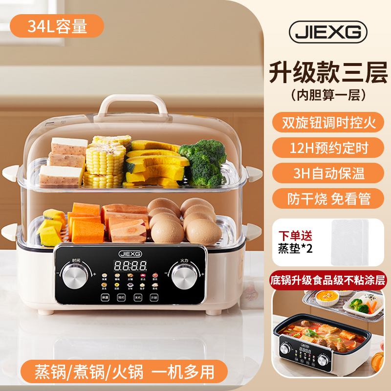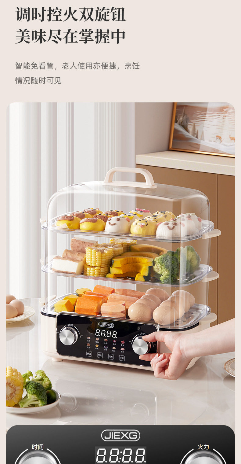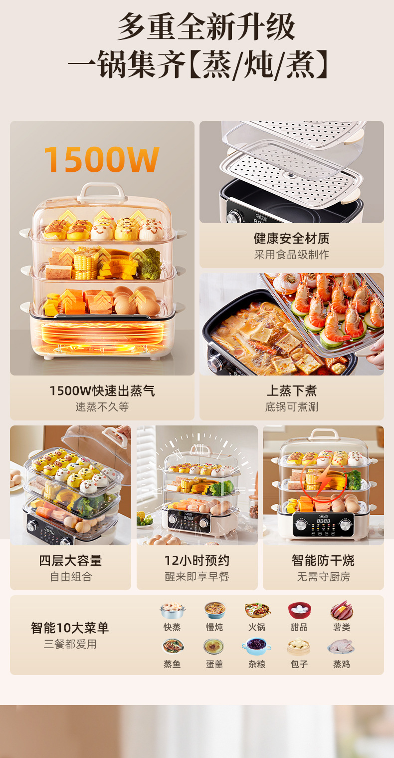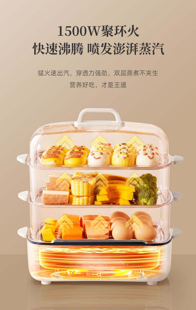 电蒸锅电蒸三层蒸煮一体蒸汽锅大容量可预约早餐机双旋钮
