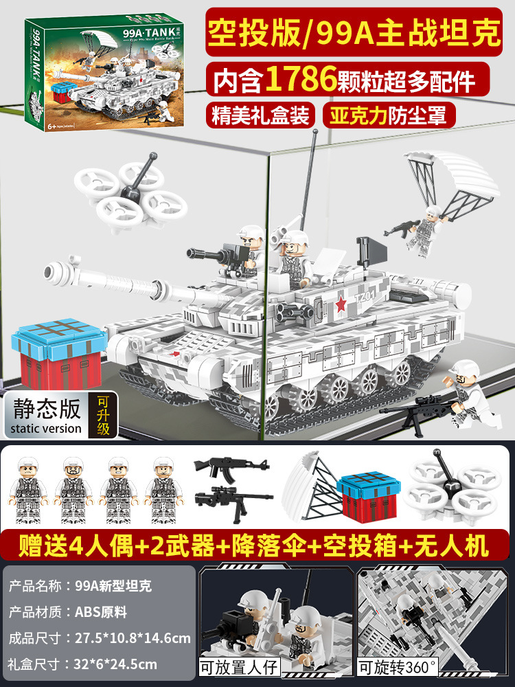 - 【雪地空投版+亚克力罩】99a主战坦克 1786颗粒 赠4人仔 2武器 降落伞 无人机 空投箱
