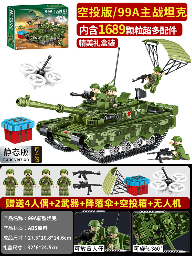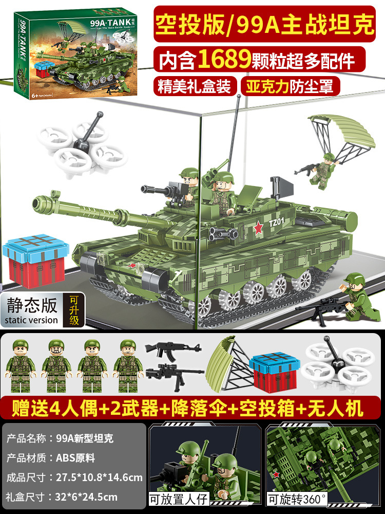 - 【空投版+亚克力罩】99a主战坦克 1689颗粒 赠4人仔 2武器 降落伞 无人机 空投箱