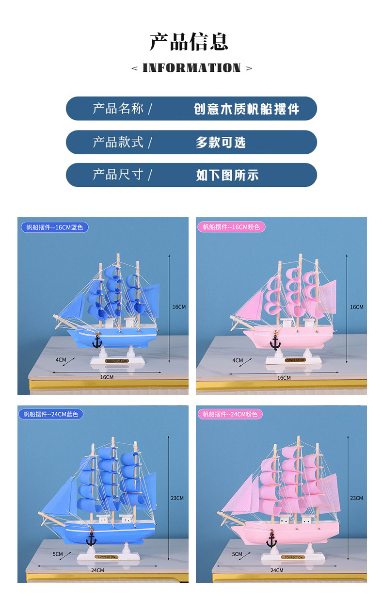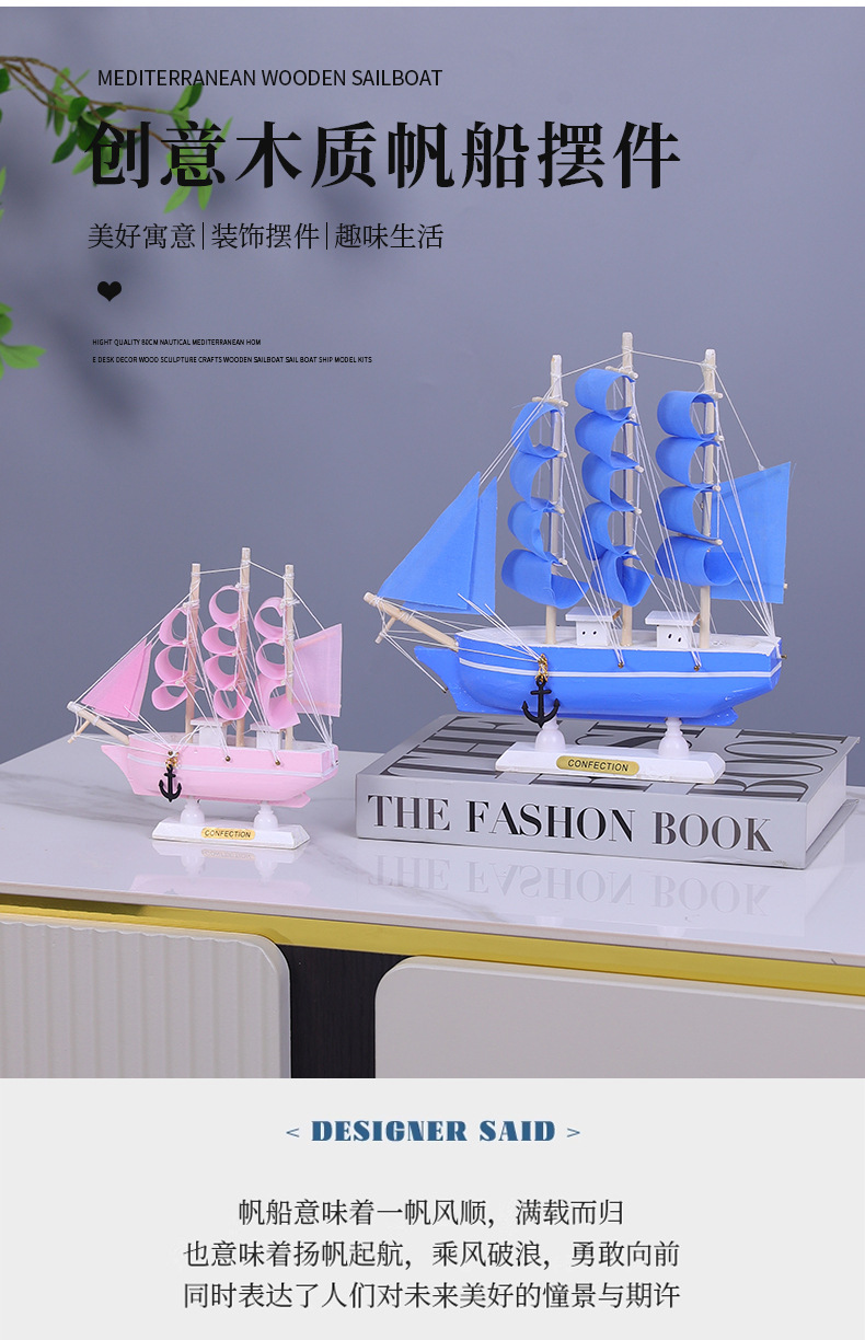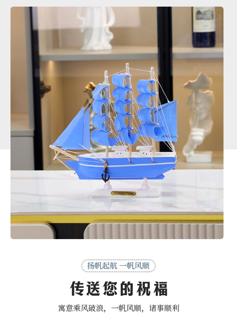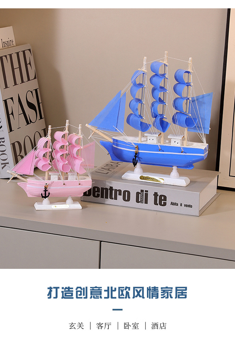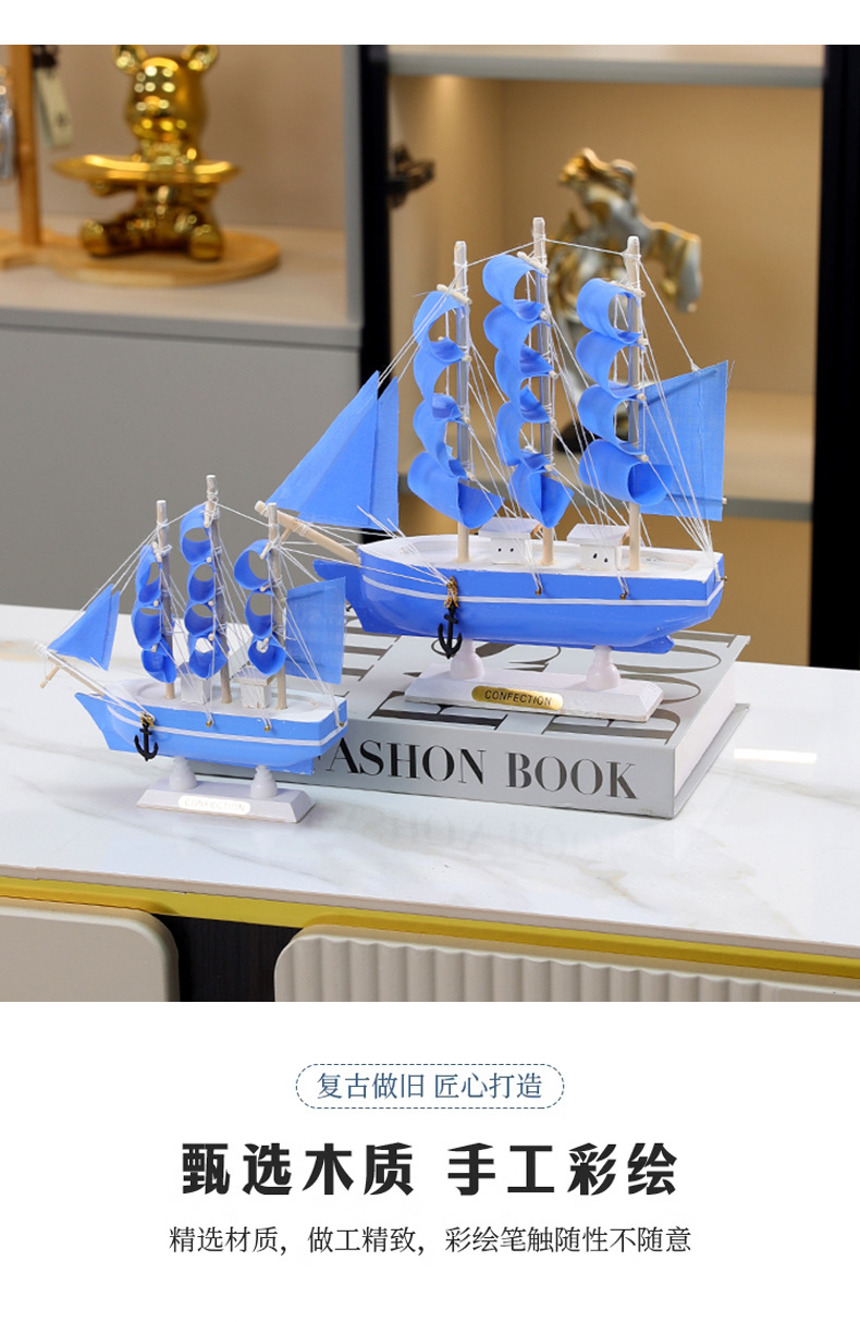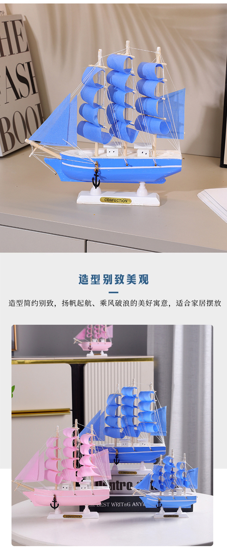 一帆风顺粉蓝地中海木质帆船摆件家居店铺装饰品帆船模型工艺品