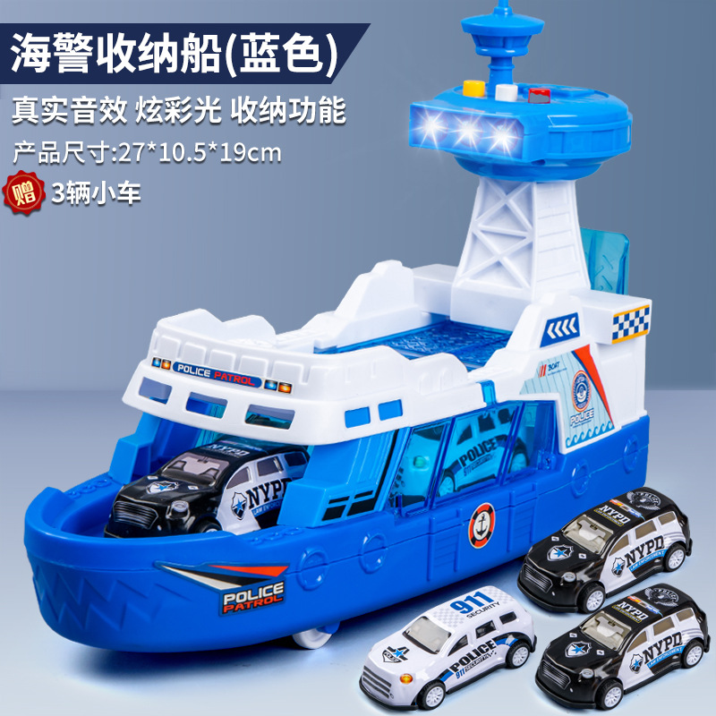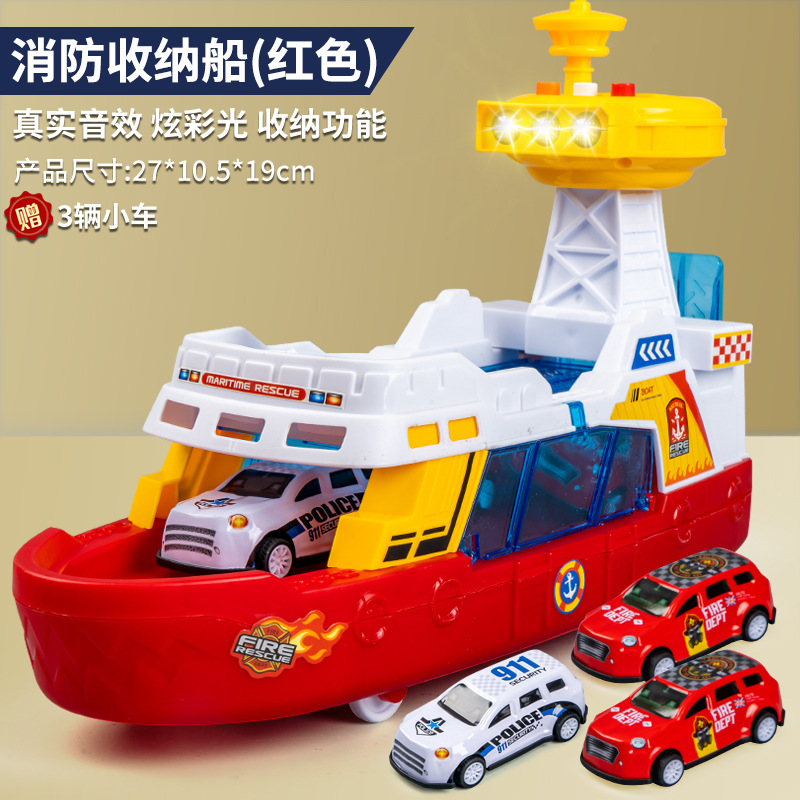仿真海上消防船模型带灯光音效船舱可开合金小车收纳船玩具模型