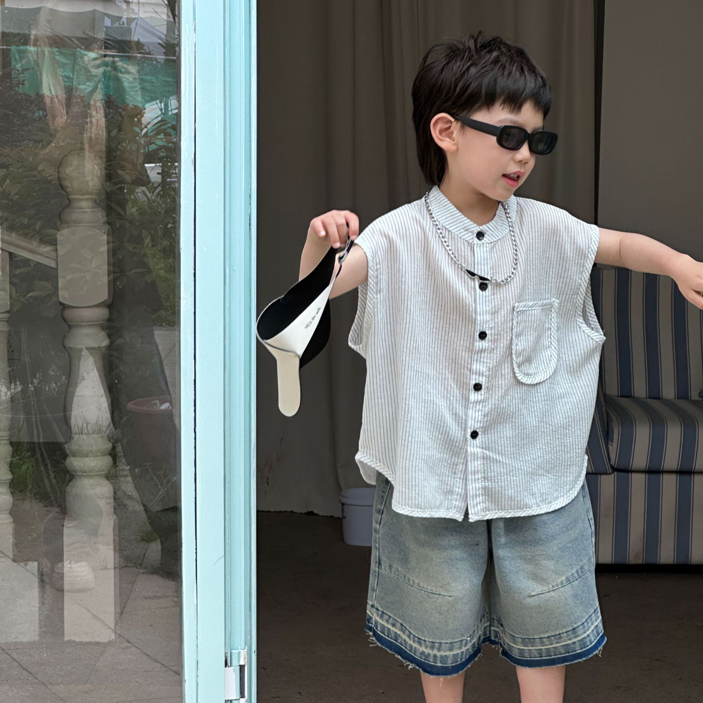 泰如夏季新款韩版男童设计感百搭竖条纹无袖衬衫儿童上衣潮