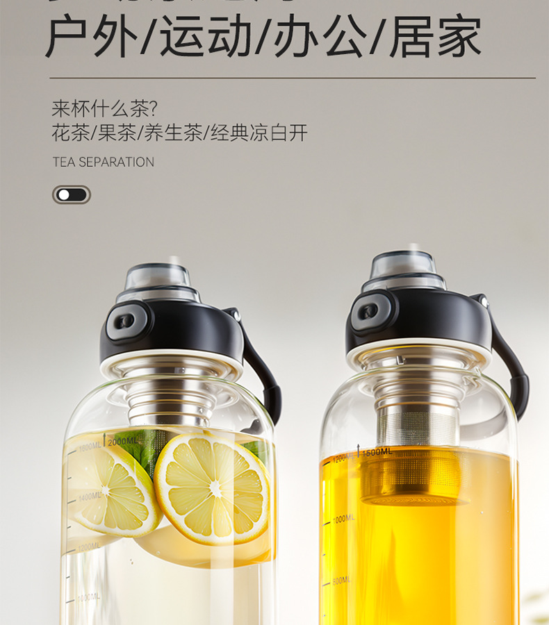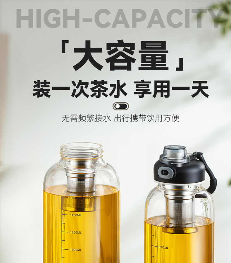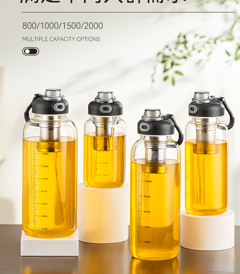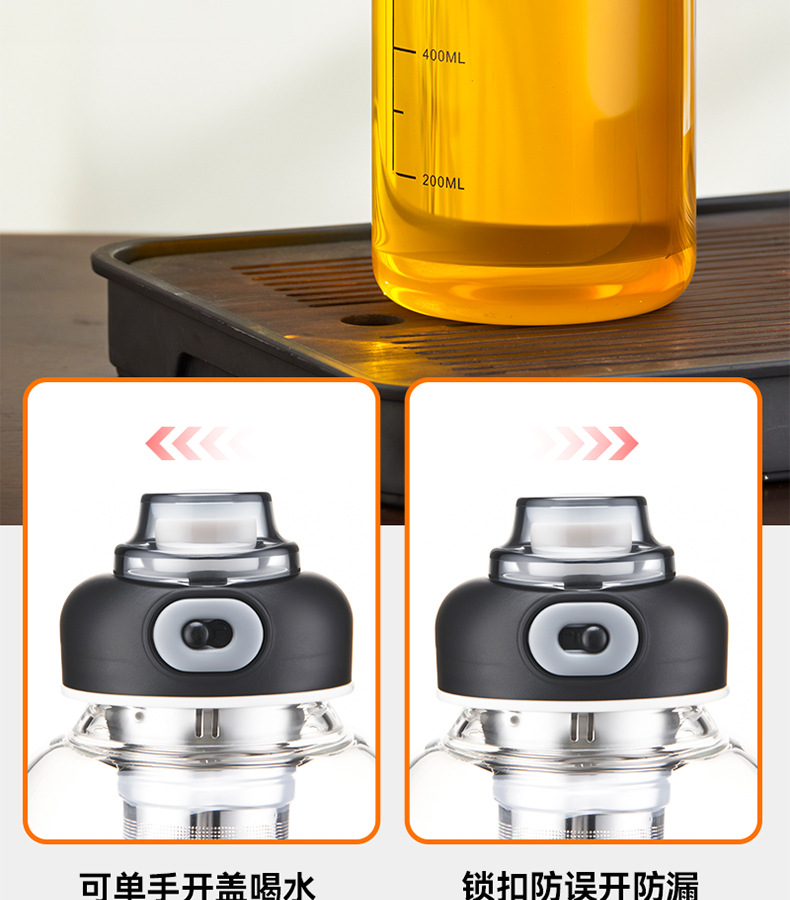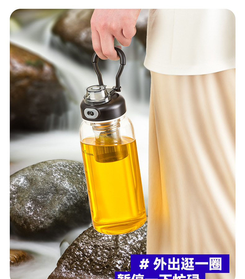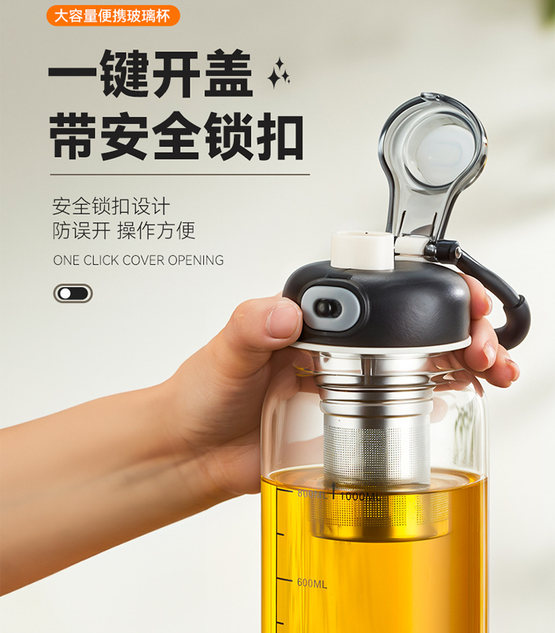 大容量便携高硼硅玻璃杯 一键开盖带刻度可手提茶水分离玻璃水杯