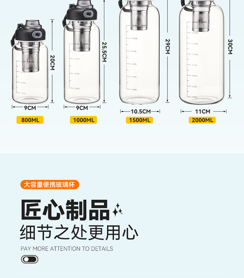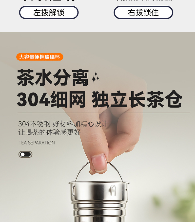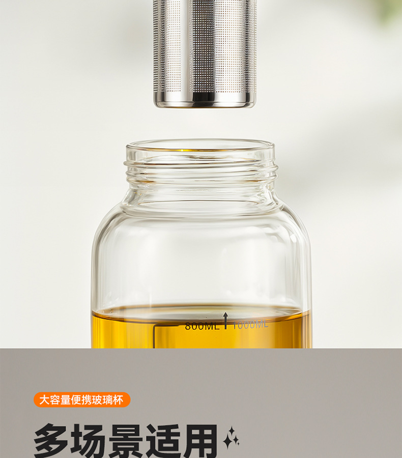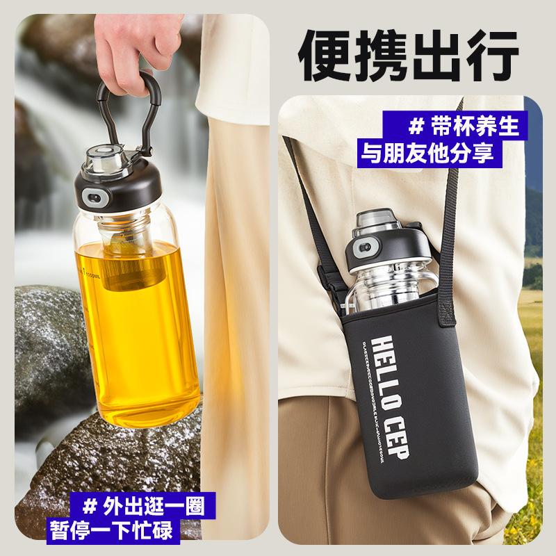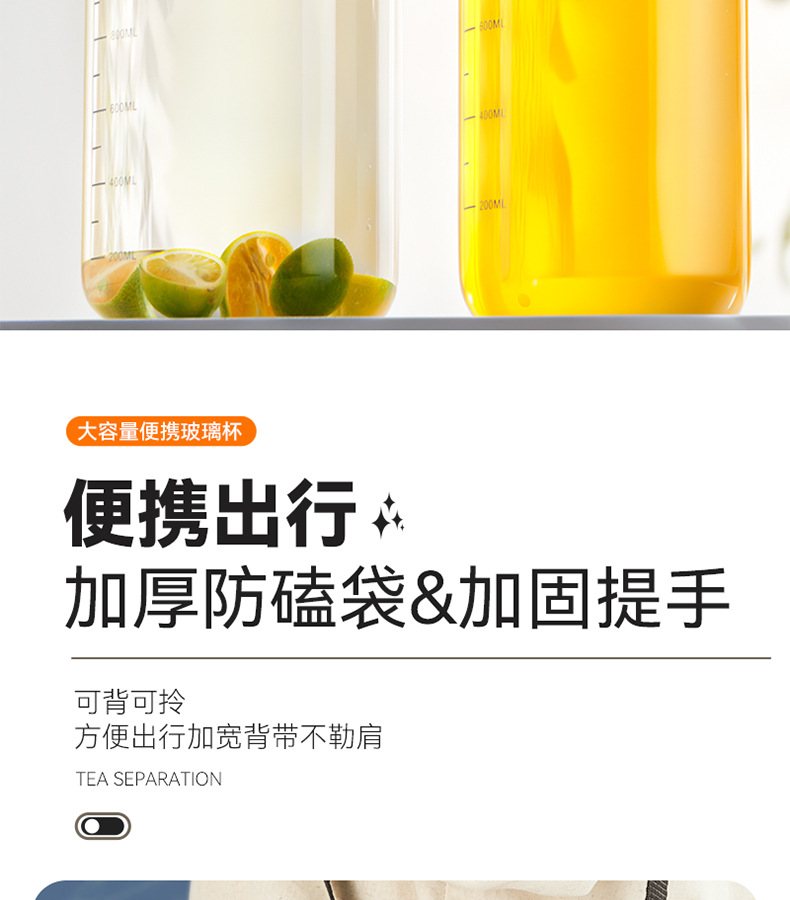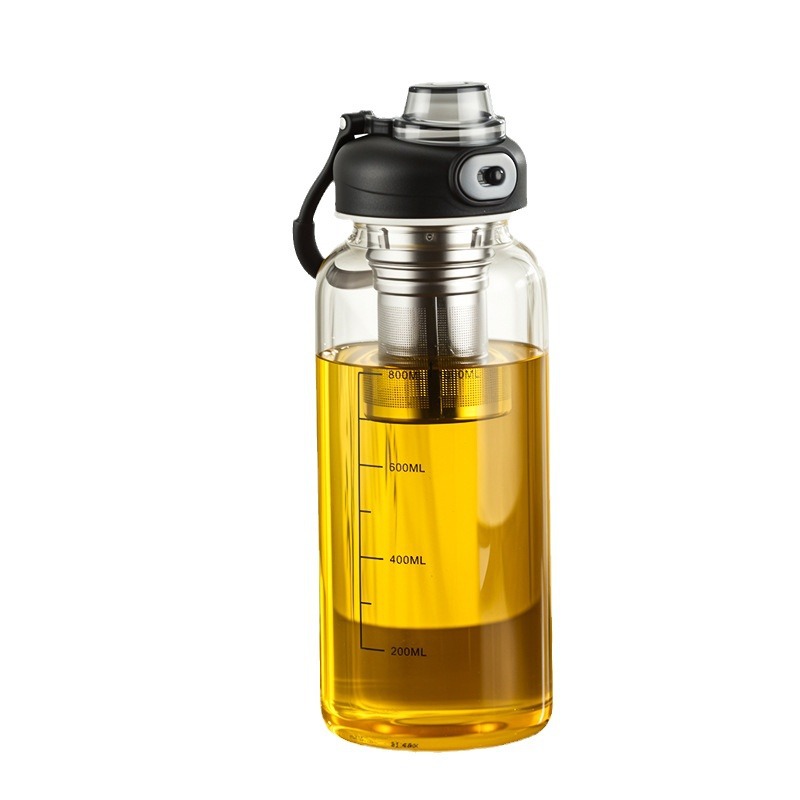 大容量便携高硼硅玻璃杯 一键开盖带刻度可手提茶水分离玻璃水杯