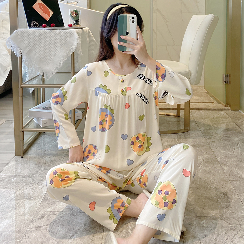 夏季新款睡衣女士人棉绵绸长袖长裤圆领套头套装薄款睡衣