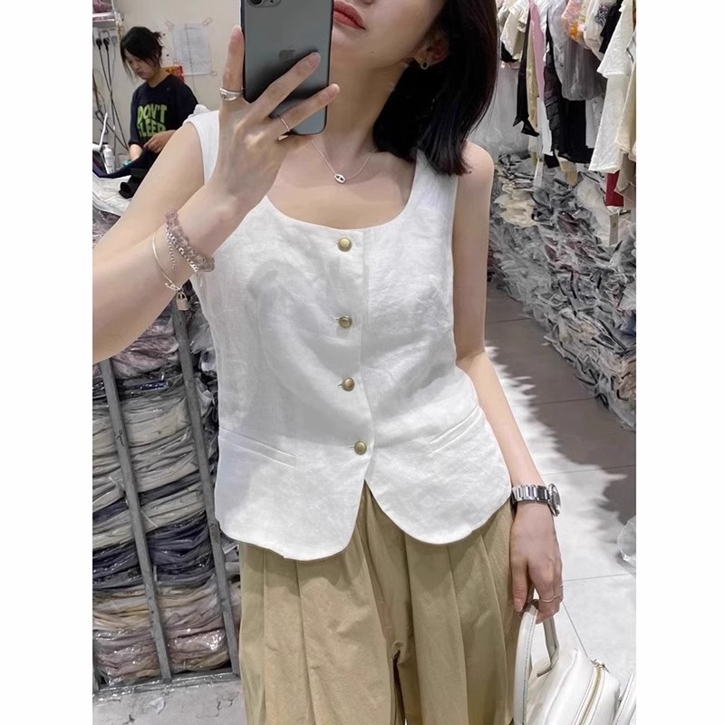 小香风棉麻无袖背心马甲女夏季新款法式简约纯色亚麻坎肩百搭上衣