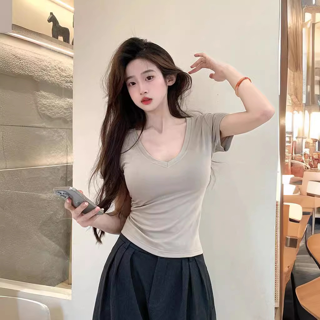 短袖新款女夏季修身显瘦t恤女士性感v领上衣女内搭打底衫潮