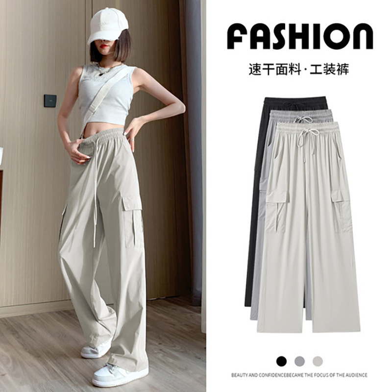 美式工装裤女夏季薄款新款高腰宽松冰丝速干运动休闲阔腿裤子