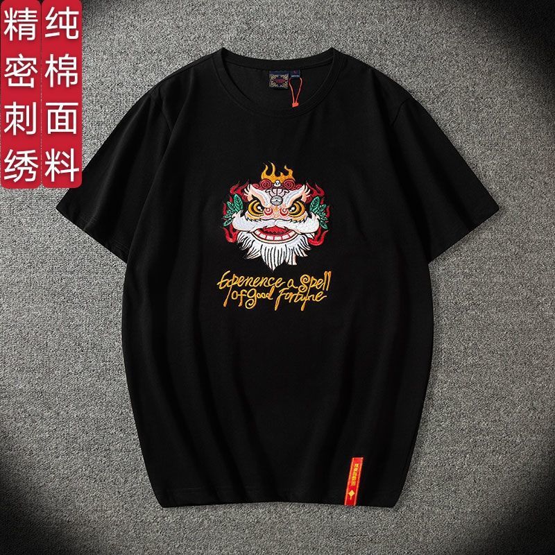短袖男棉t恤醒狮刺绣新款夏季国潮中国风大码圆领宽松情侣装