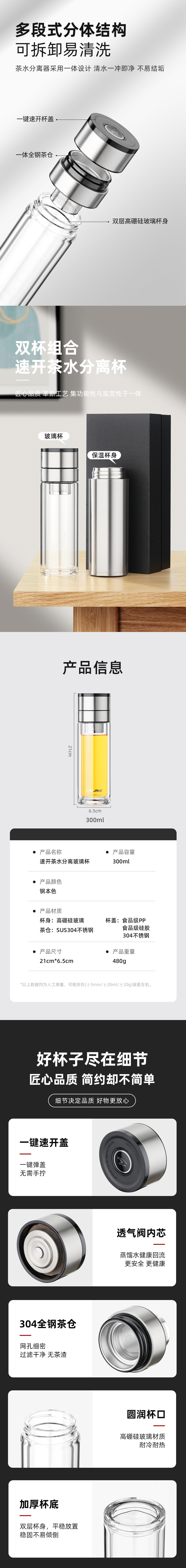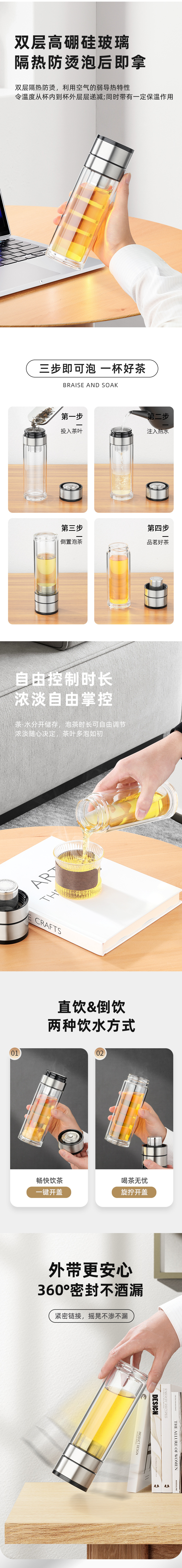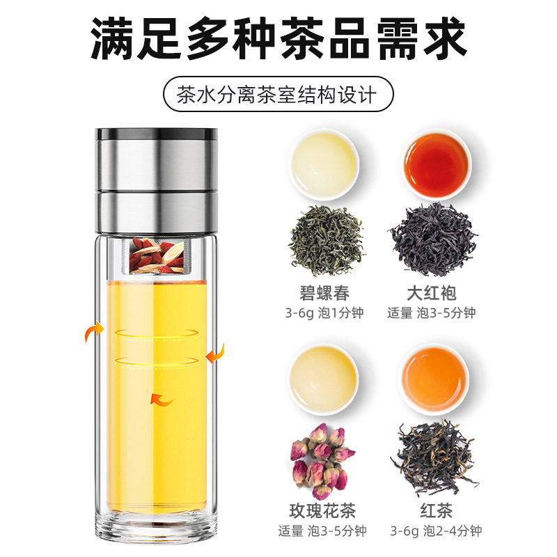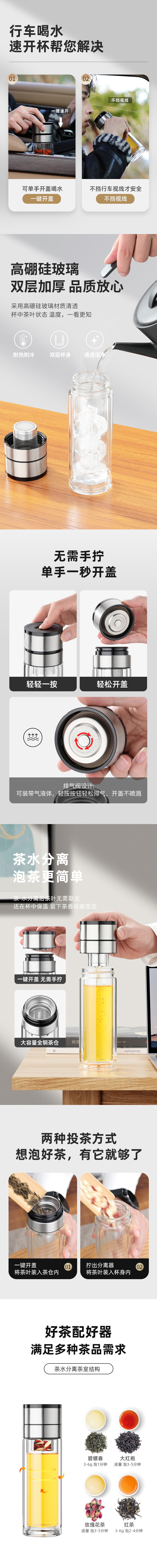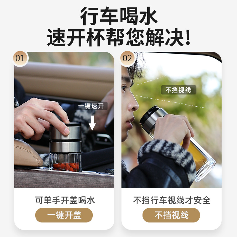 一键单手开盖玻璃杯男女士高档双层速开茶水分离杯车载泡茶杯