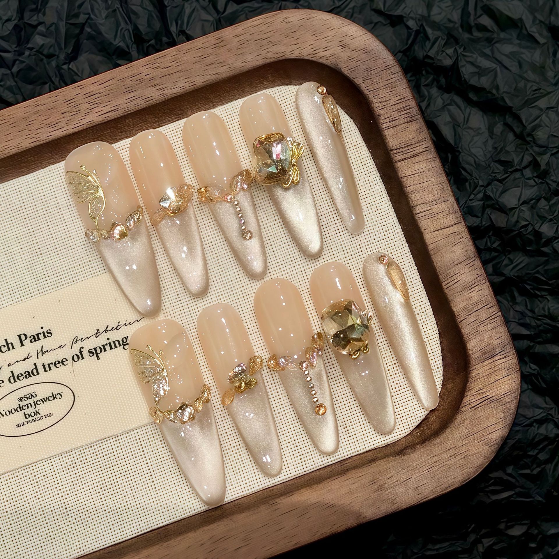 艺禾 香槟侧光猫眼法式小碎钻鎏金枯叶蝶高级感长款纯手工穿戴甲