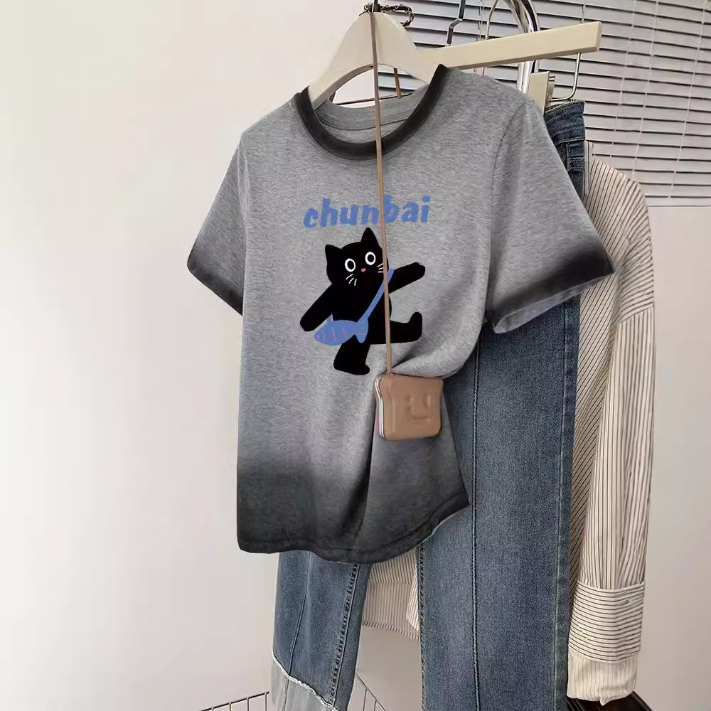 法式欧货高级感可爱印花正肩圆领渐变色宽松短袖T恤女夏季减龄