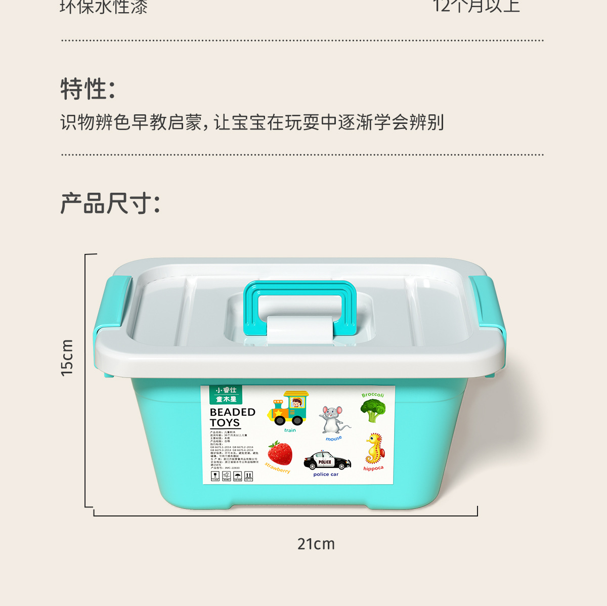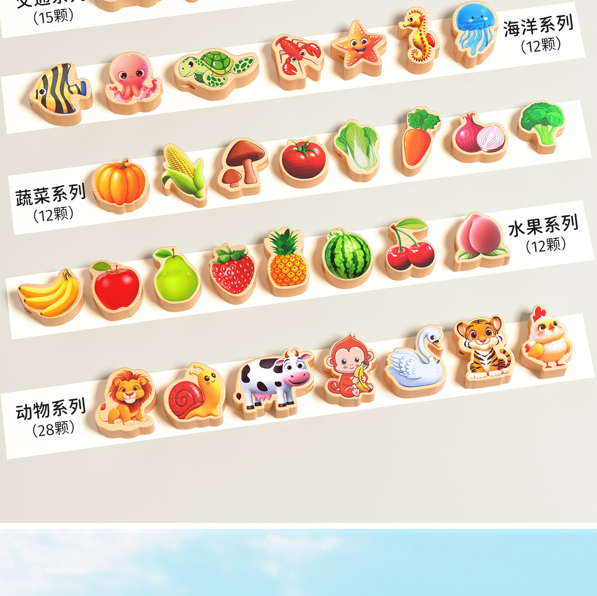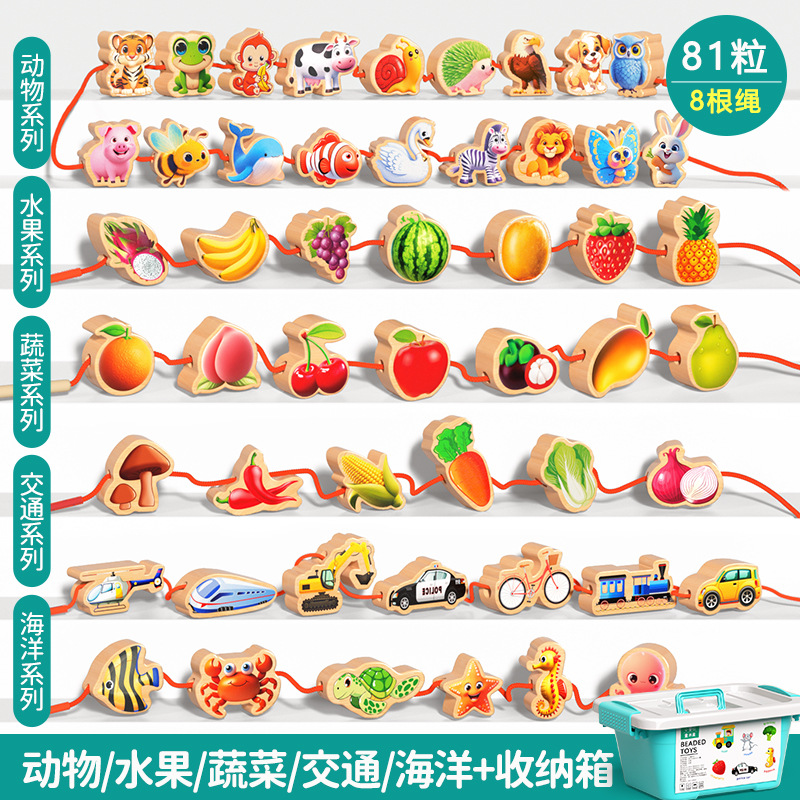 - 全实木81粒大颗粒串珠【水果+动物+蔬菜+交通+海洋+8根绳子】收纳盒