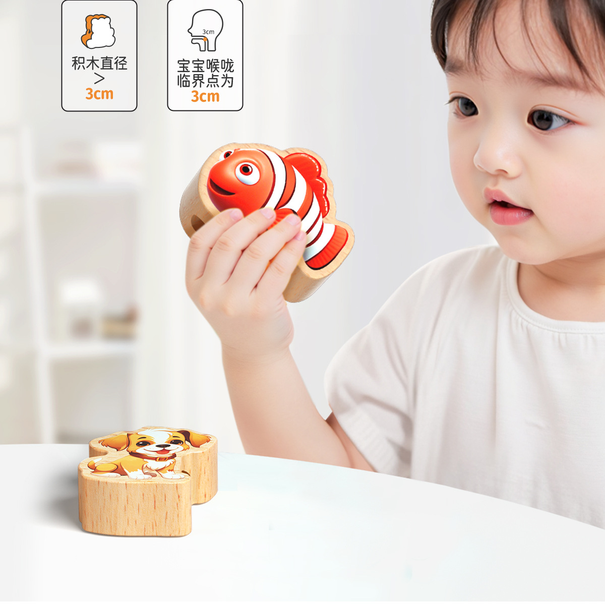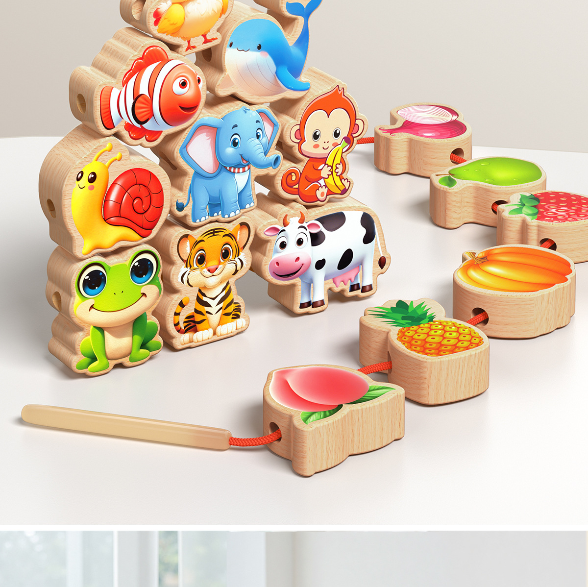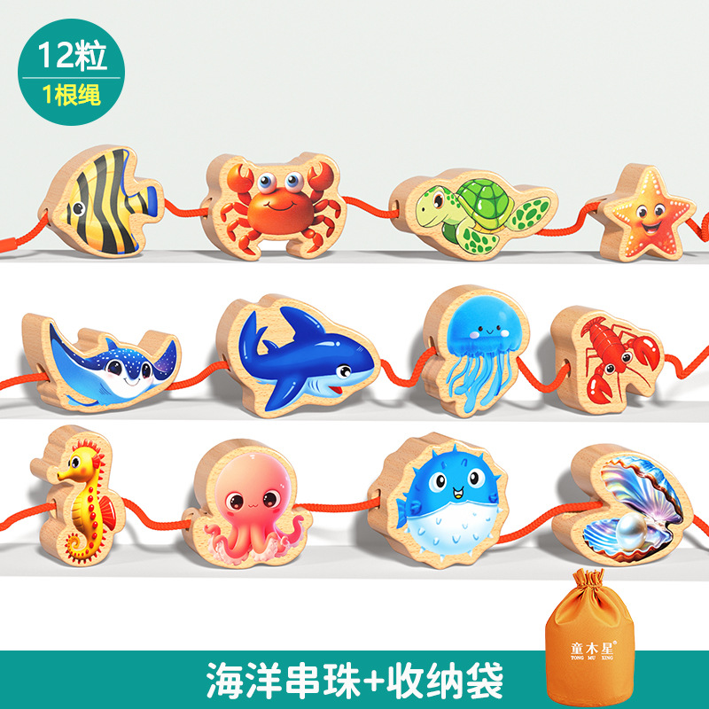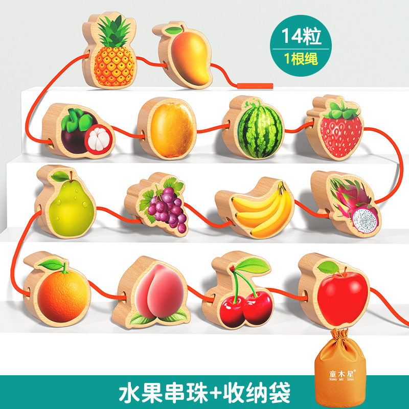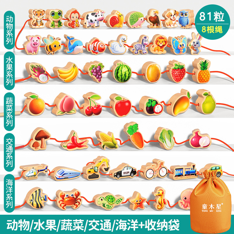 - 全实木81粒大颗粒串珠【水果+动物+蔬菜+交通+海洋+8根绳子】袋装