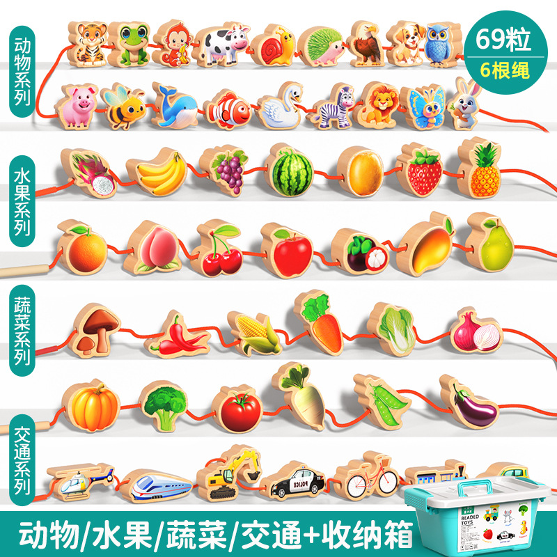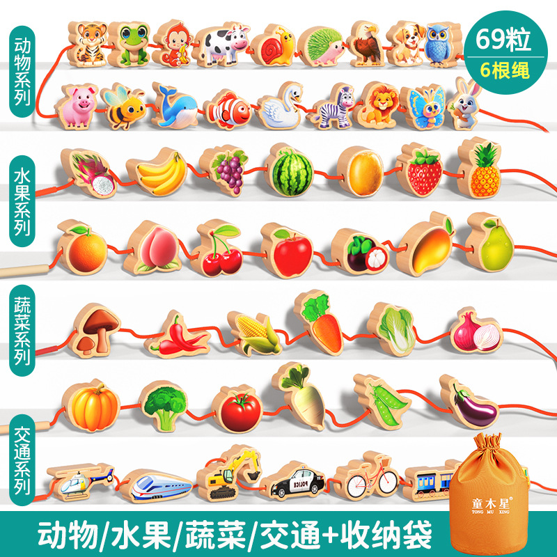 - 全实木69粒大颗粒串珠【水果+动物+蔬菜+交通+6根绳子】袋装