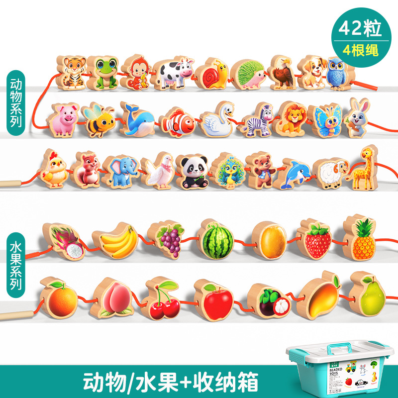 - 全实木42粒大颗粒串珠【水果+动物+4根绳子】收纳盒