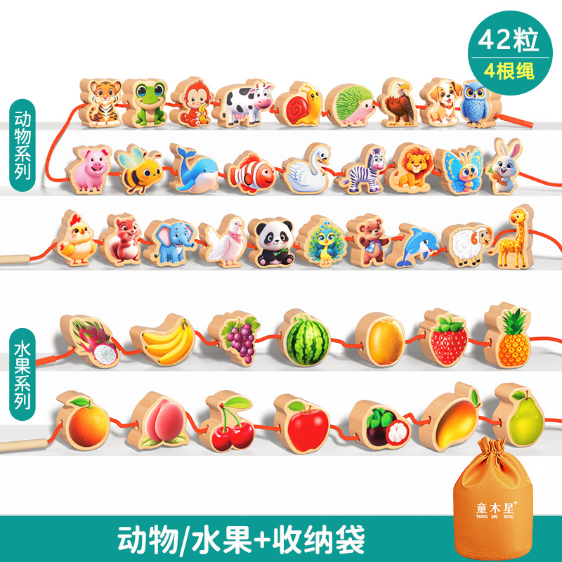 - 全实木42粒大颗粒串珠【水果+动物+4根绳子】袋装