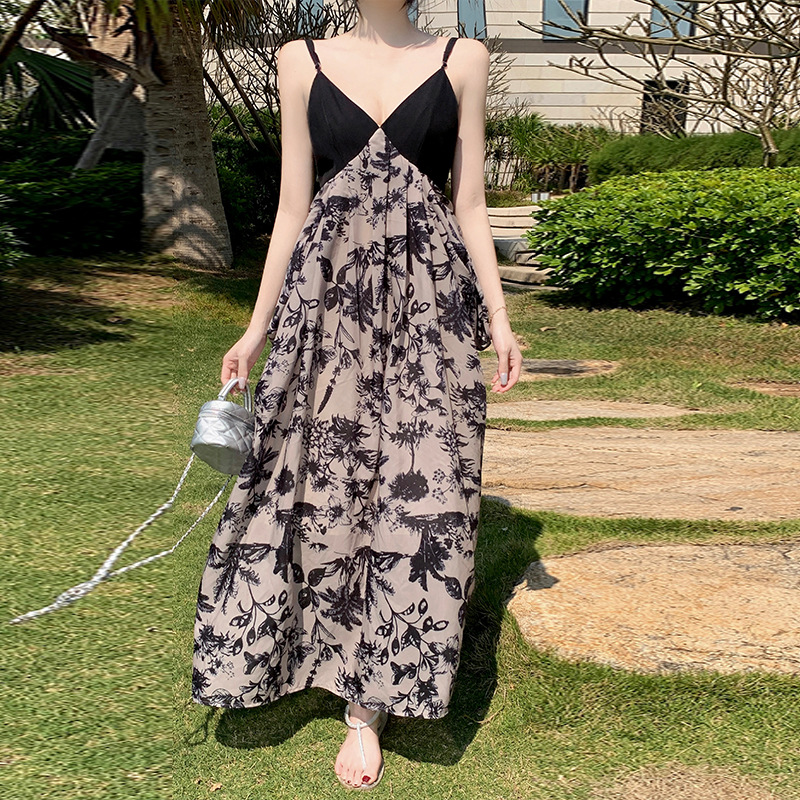 清冷V领露背吊带休闲沙滩度假连衣裙水墨新中式吊带长裙女
