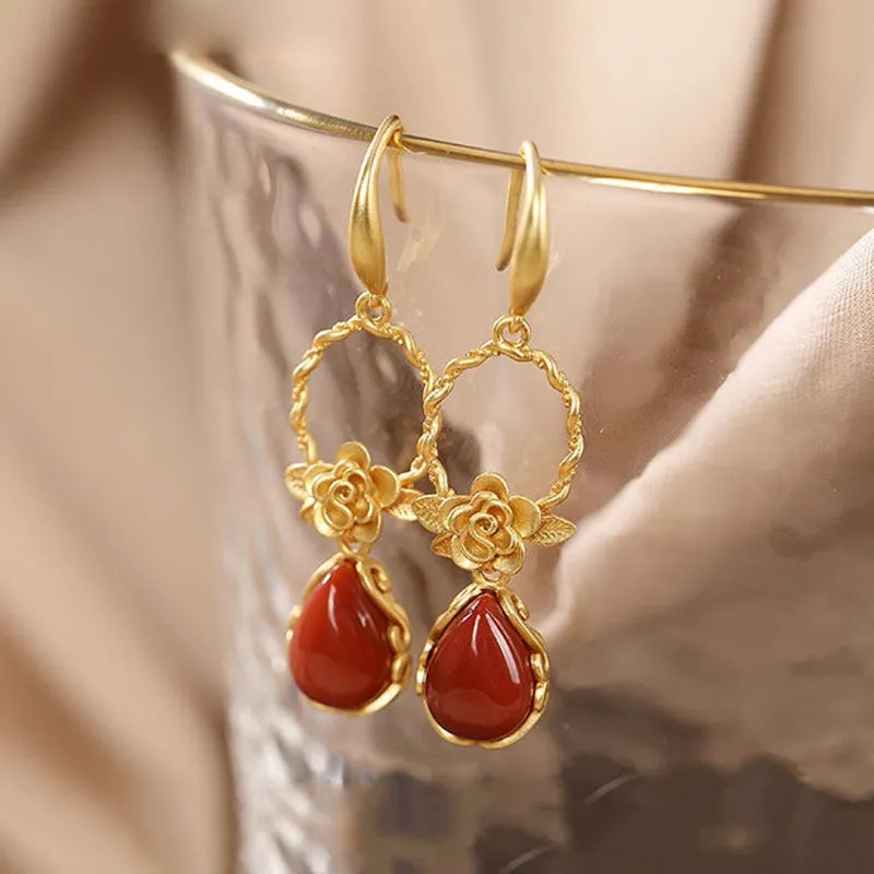 S925纯银水滴吊坠耳环女镶嵌牡丹花耳坠复古气质宫廷耳饰