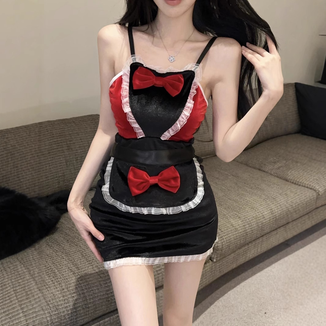 立体蝴蝶结装饰气质纯欲拼接撞色吊带低胸包臀蕾丝圣诞性感连衣裙