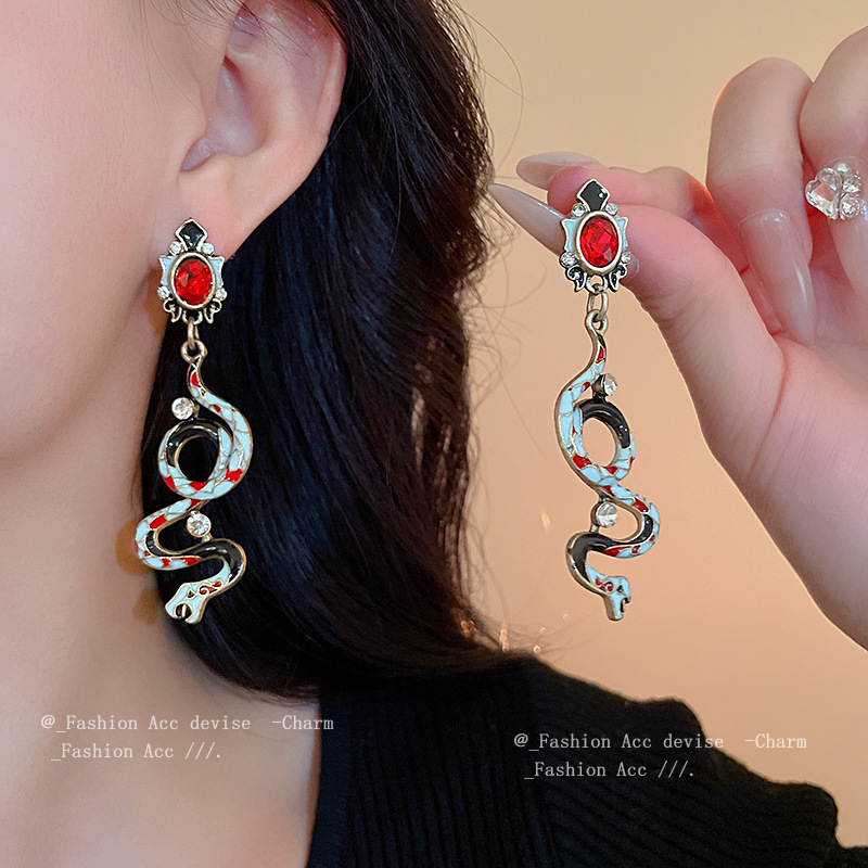 vintage中古银针滴油镶钻小蛇耳环宫廷风复古设计耳坠高级感饰品