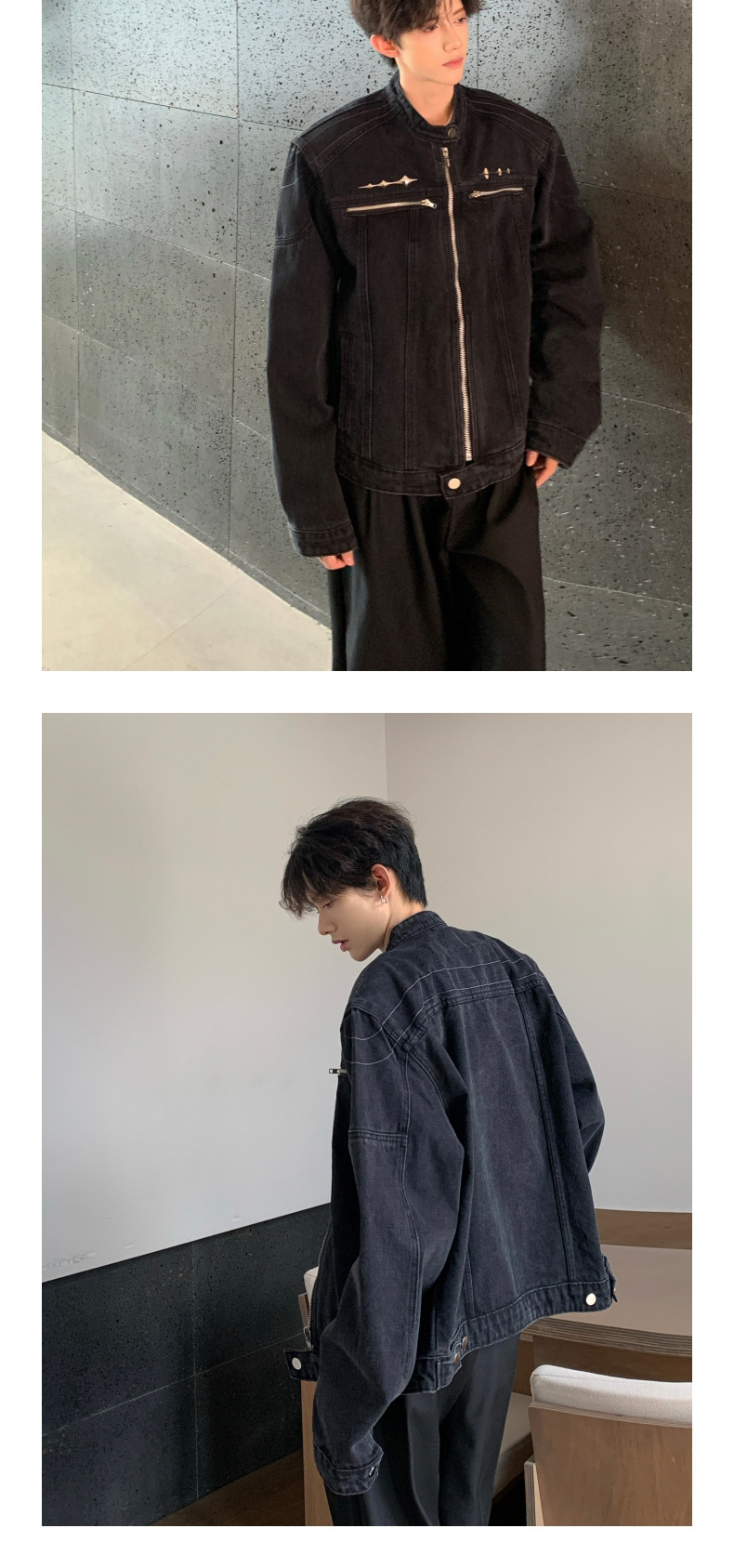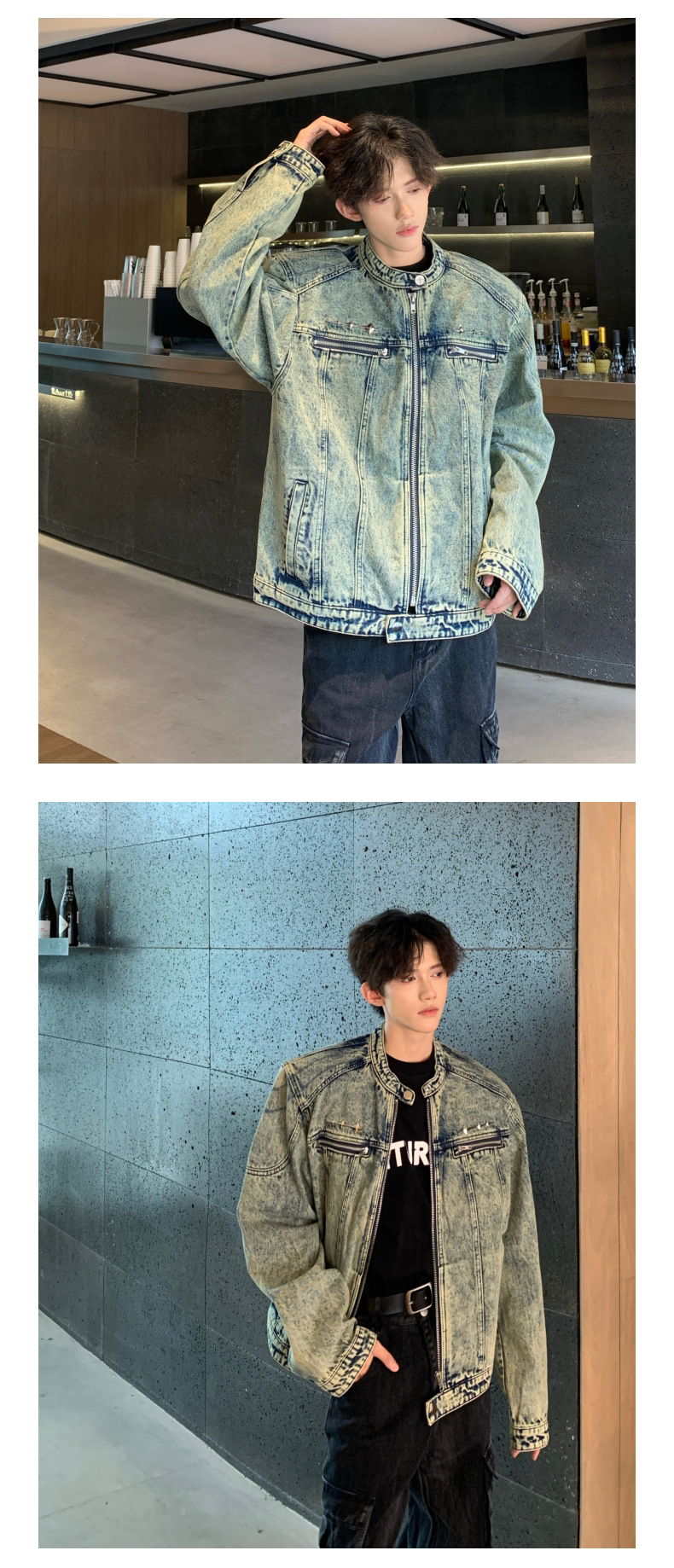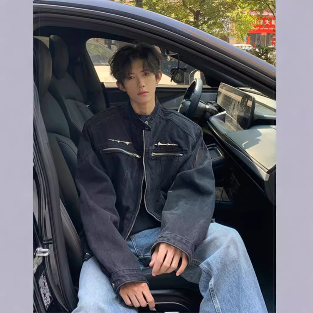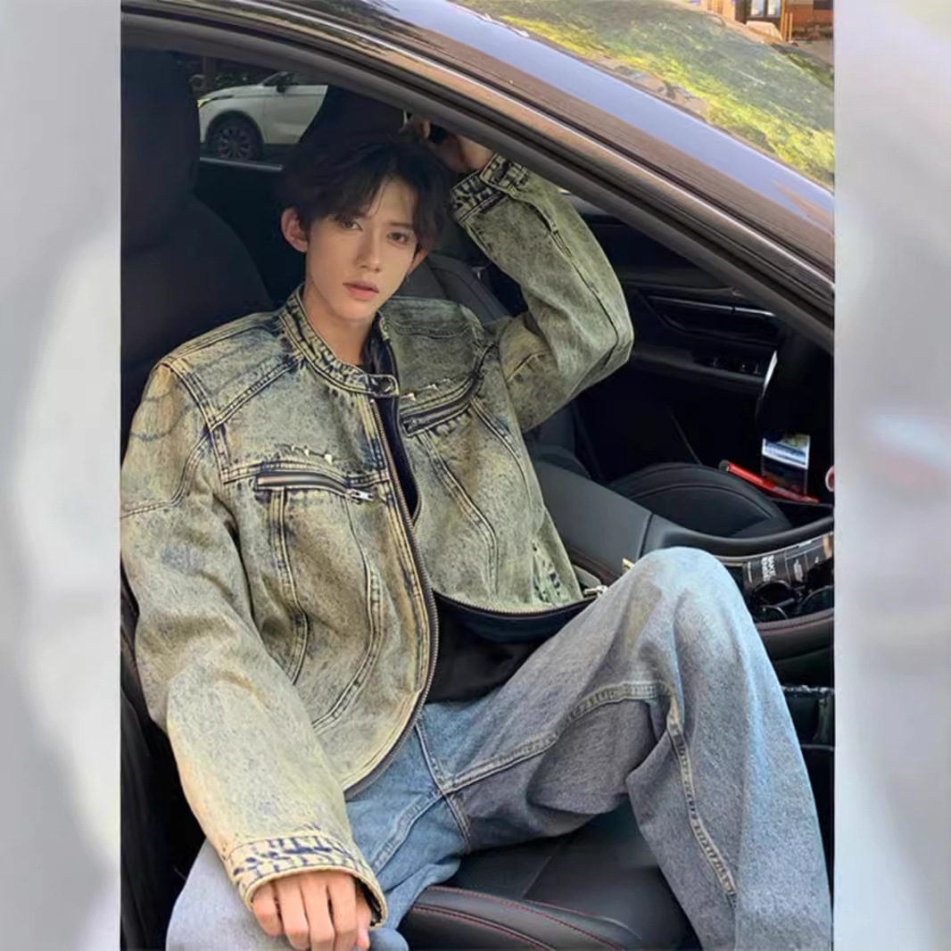 垫肩牛仔外套男款秋季无领夹克短款水洗做旧设计感牛仔衣