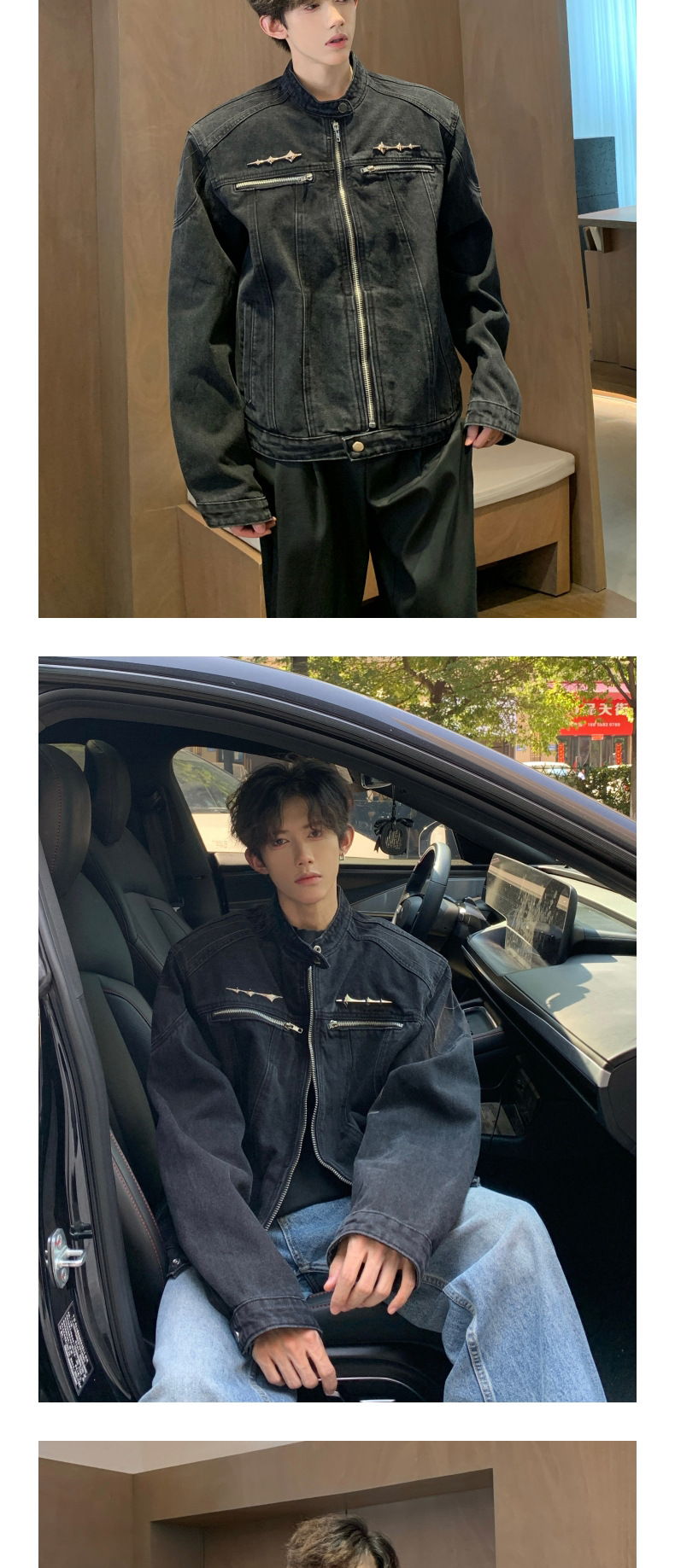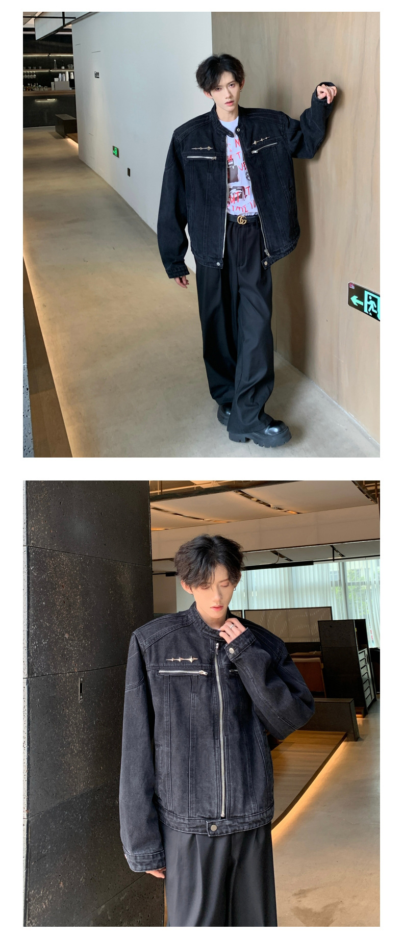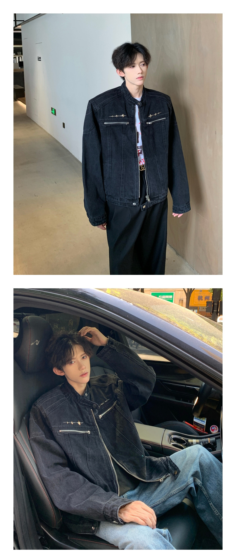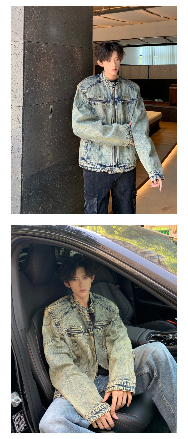 垫肩牛仔外套男款秋季无领夹克短款水洗做旧设计感牛仔衣