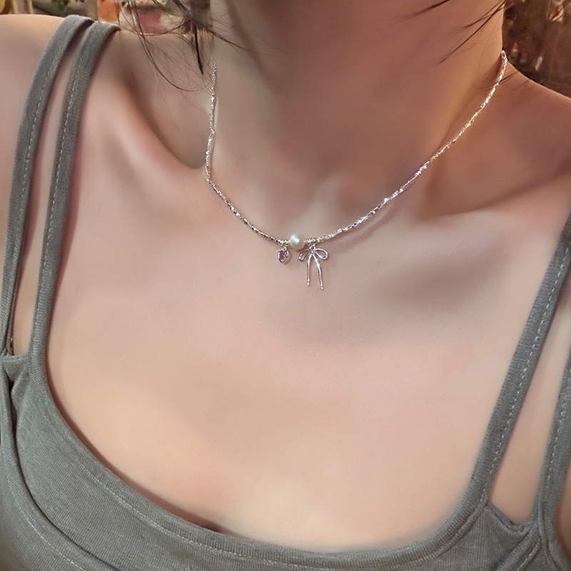 芭蕾风蝴蝶结粉钻爱心项链女夏轻奢碎银子珍珠高级感锁骨颈链配饰