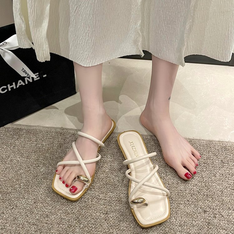 夏季新款平底拖鞋女外穿套脚金属扣交叉一字拖方头凉拖