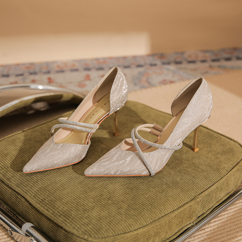 高跟鞋女细跟新款尖头水晶婚鞋水钻侧空单鞋