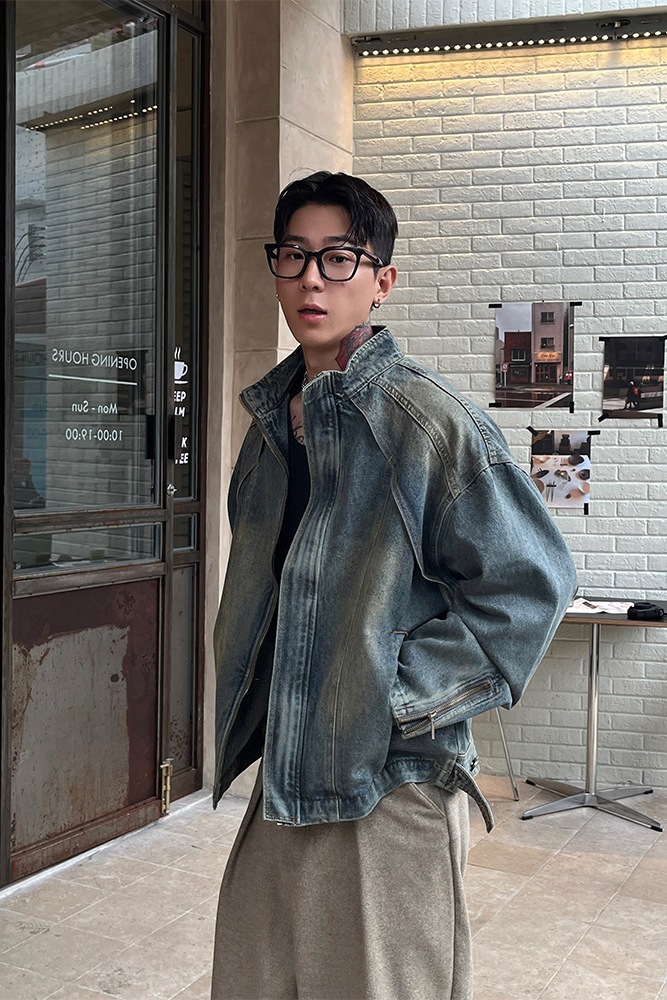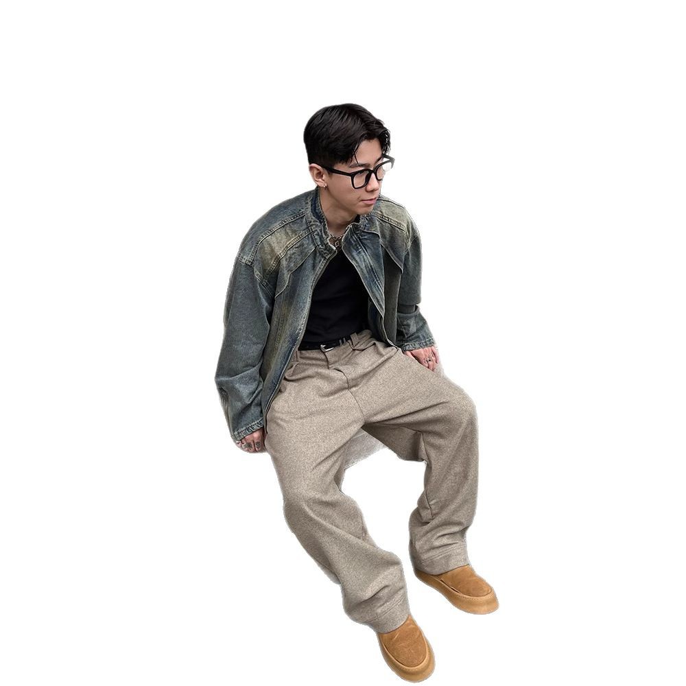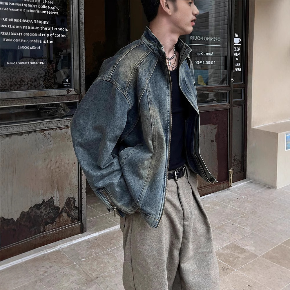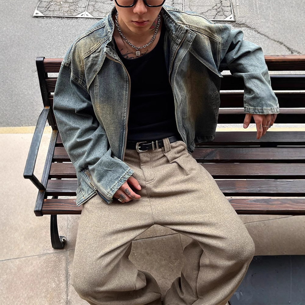 水洗渐变复古黄泥染色牛仔衣重磅牛仔夹克外套男宽松帅气上衣