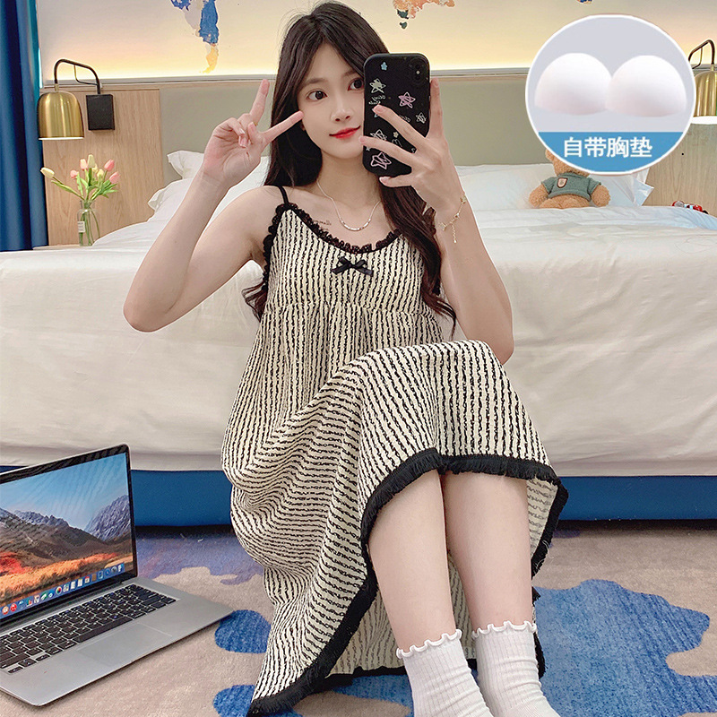 新款甜美条纹睡裙女薄款花边带胸垫睡衣吊带裙夏季韩版ims睡裙