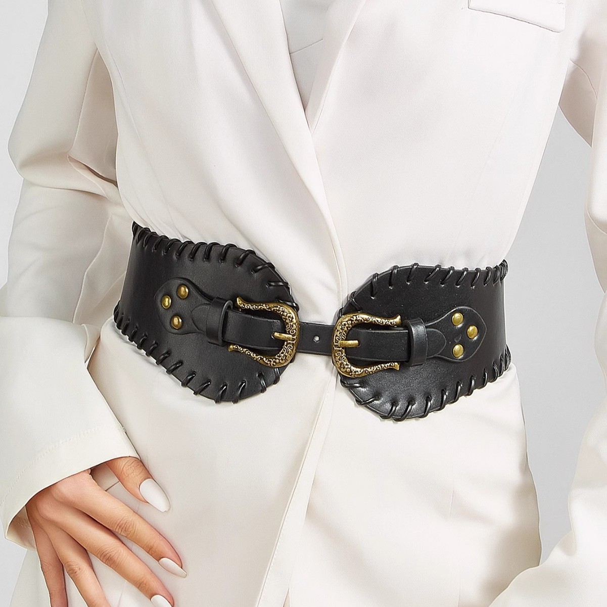 宽腰带女复古高级感时尚百搭装饰配裙子外搭潮铆钉朋克风腰封黑色