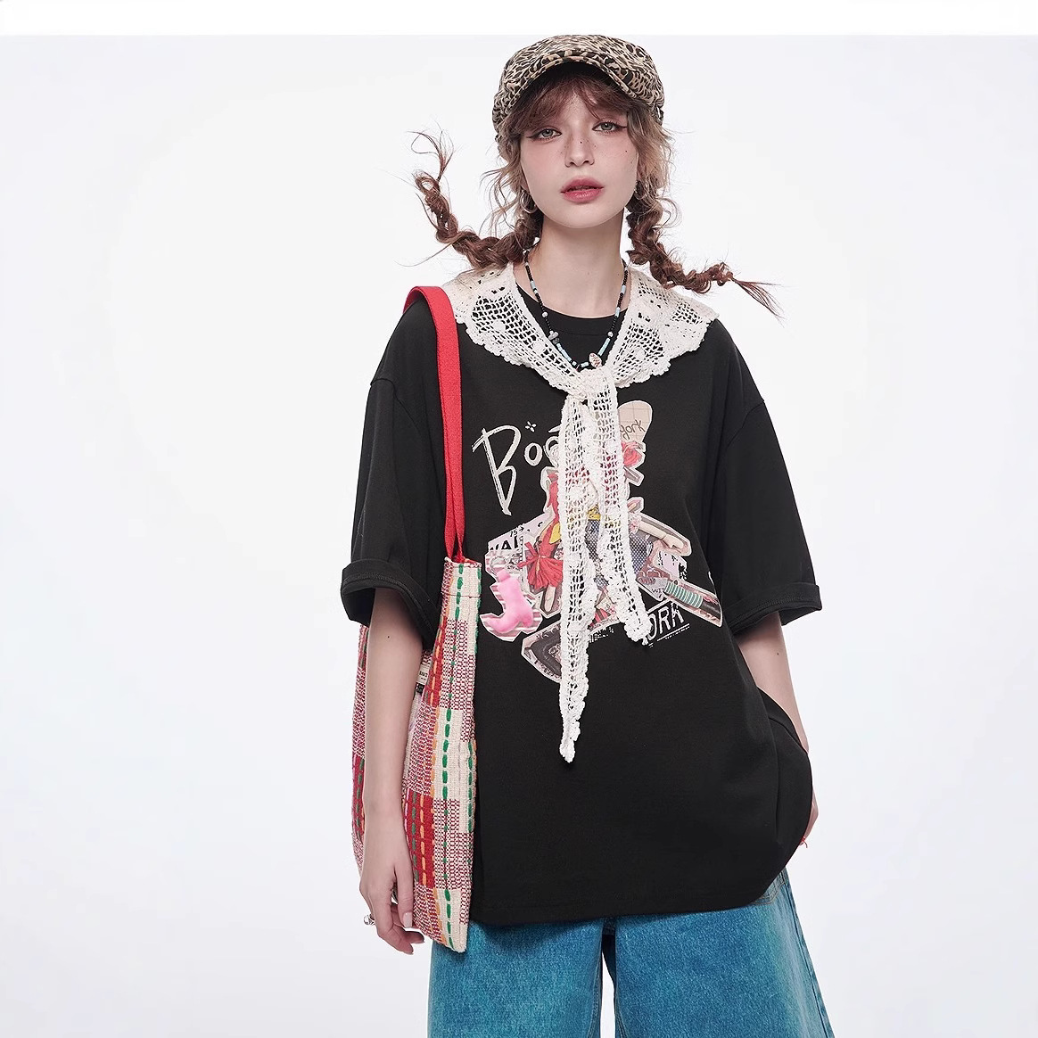 黑色印花短袖t恤女2025年春季新款宽松休闲设计感上衣