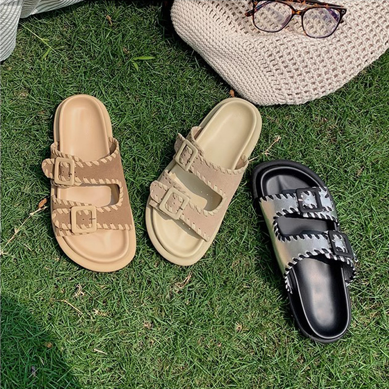 夏季新款百搭一脚蹬露趾双排扣懒人厚底增高勃肯拖鞋女