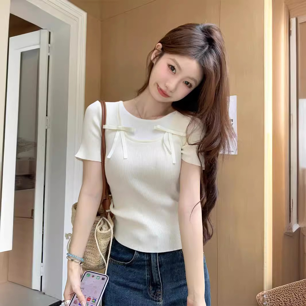 纯欲甜美撞色假两件针织衫夏设计感修身显瘦蝴蝶结芭蕾风上衣