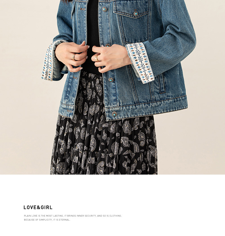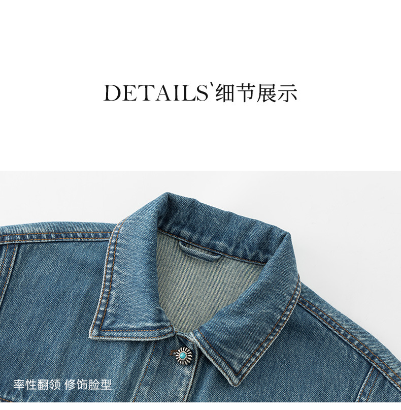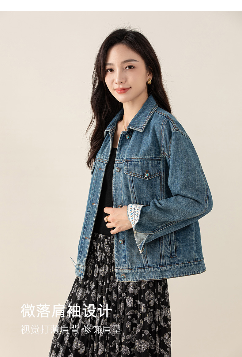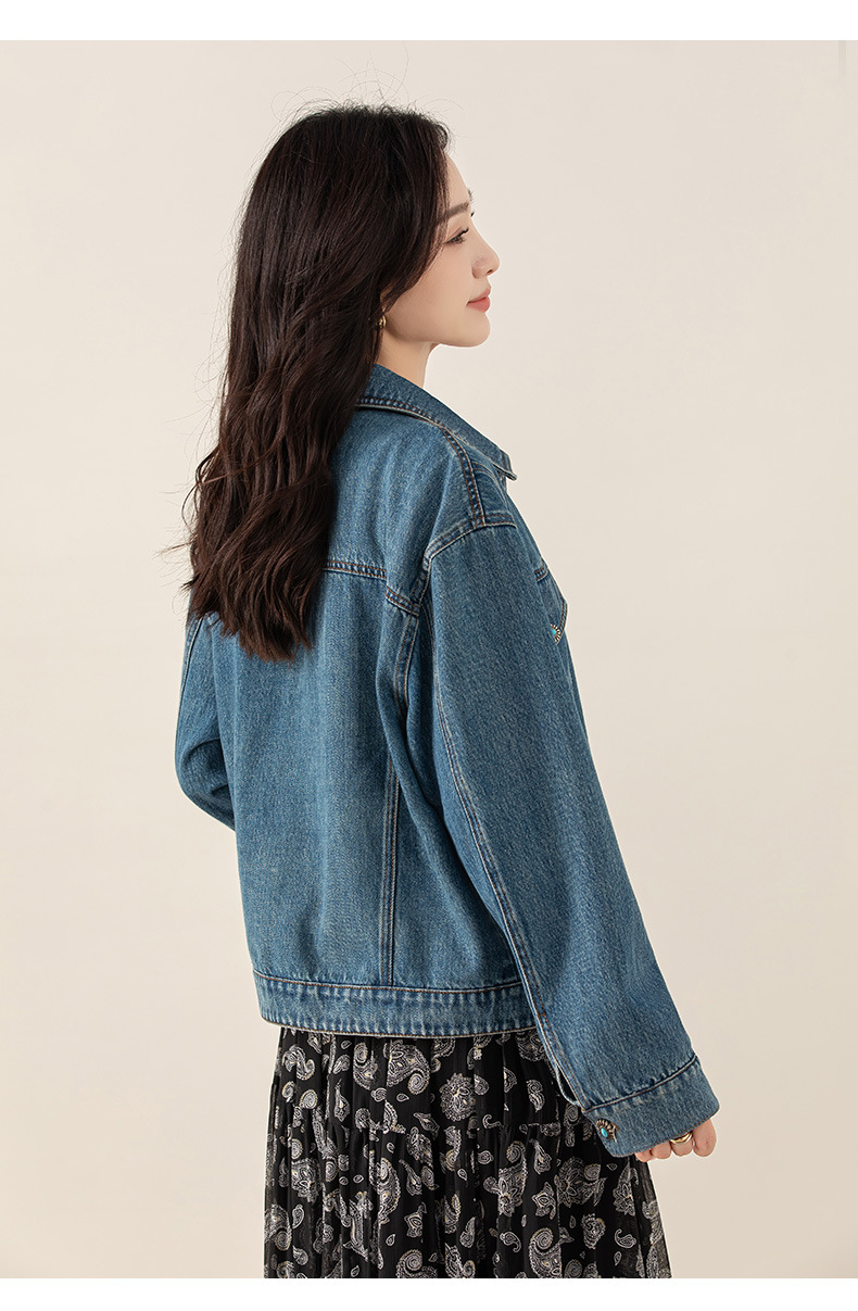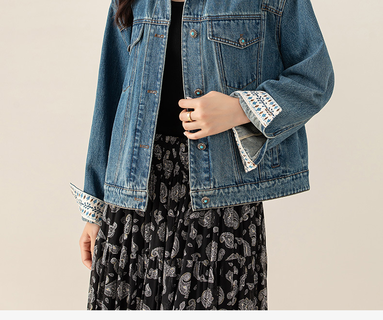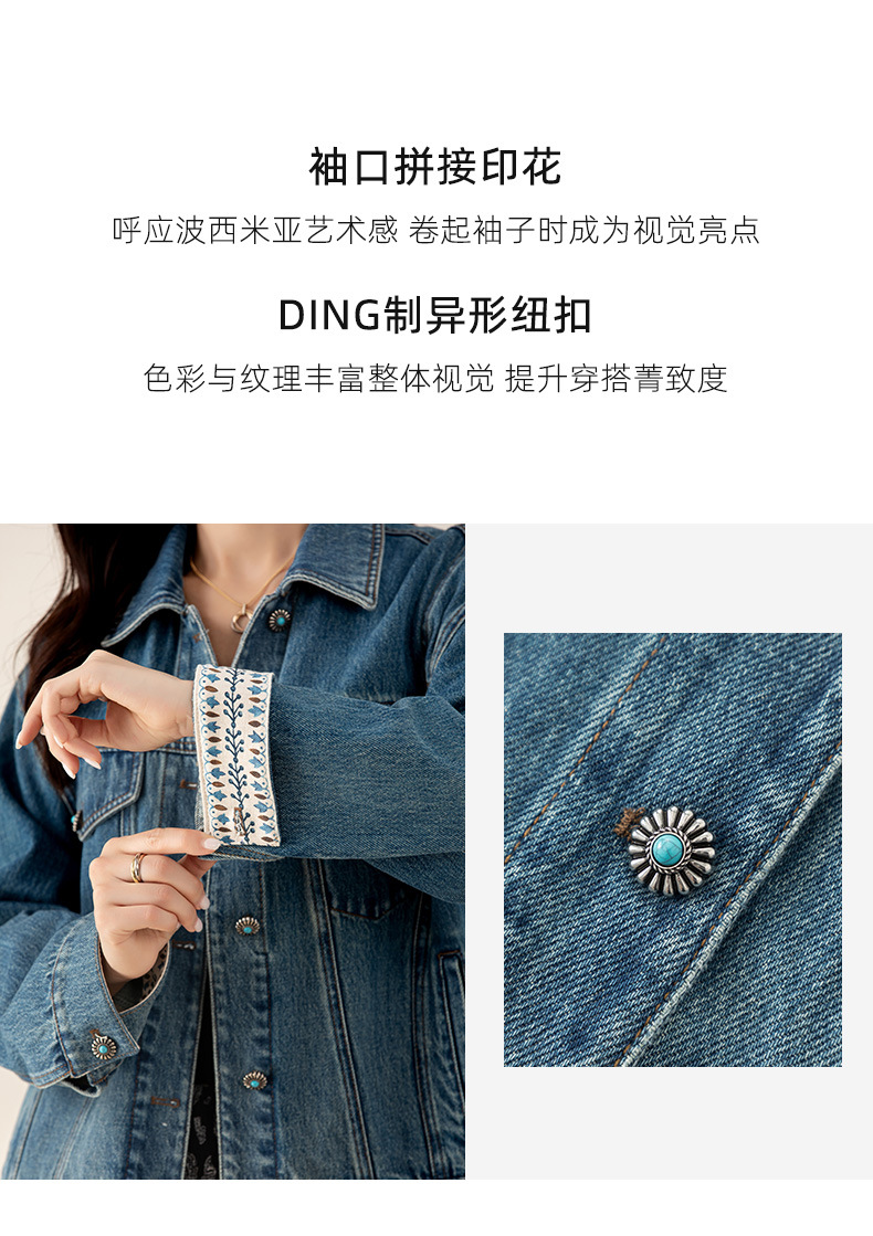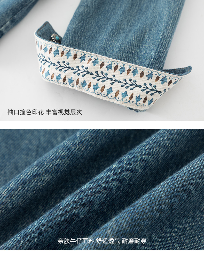 秋季复古水洗牛仔外套女设计感拼接蓝色印花翻边袖口新款上衣