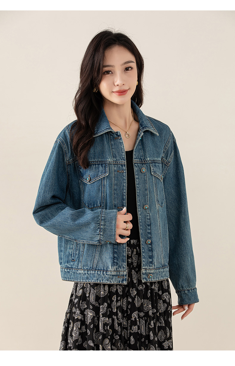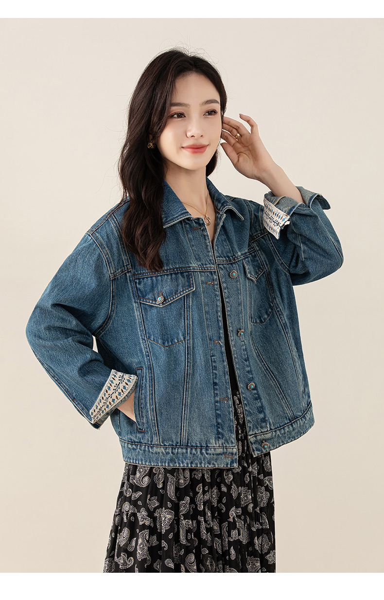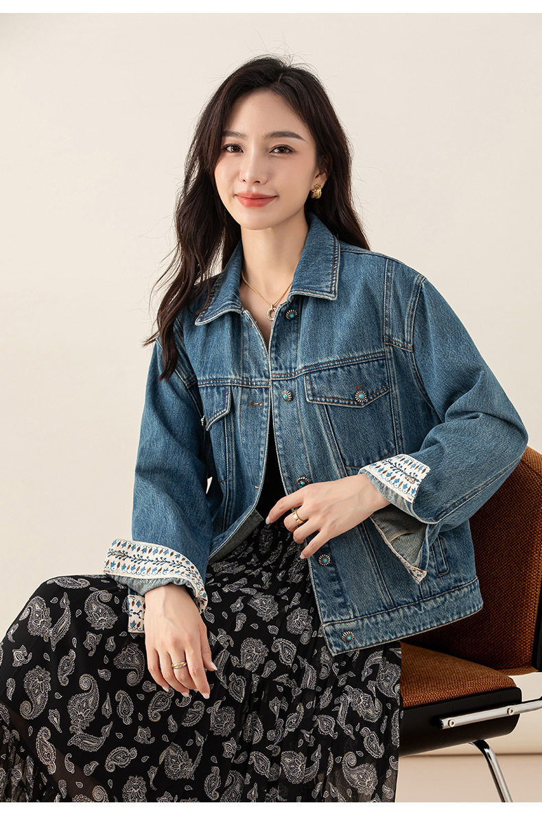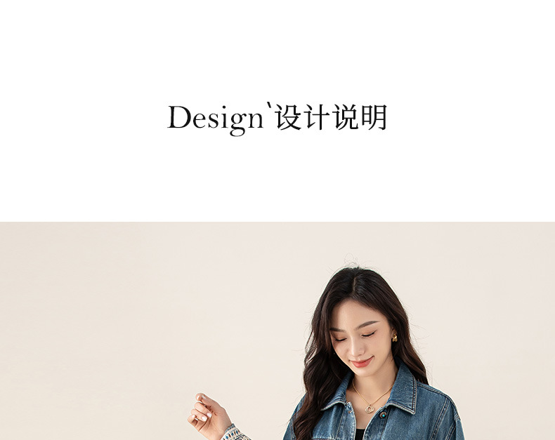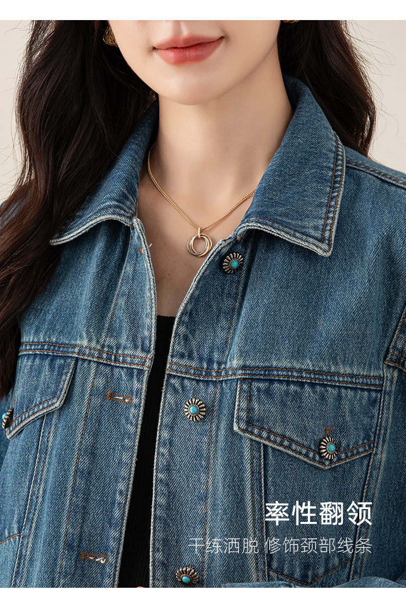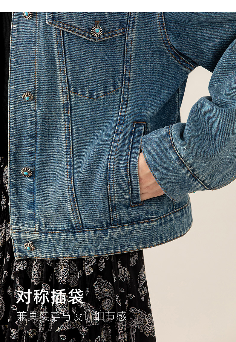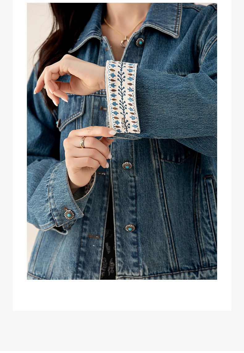 秋季复古水洗牛仔外套女设计感拼接蓝色印花翻边袖口新款上衣