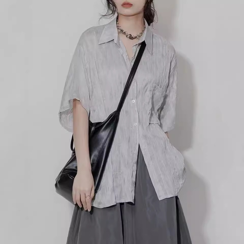 设计感褶皱短袖衬衫女夏季肌理感小众宽松百搭休闲不对称别致衬衣